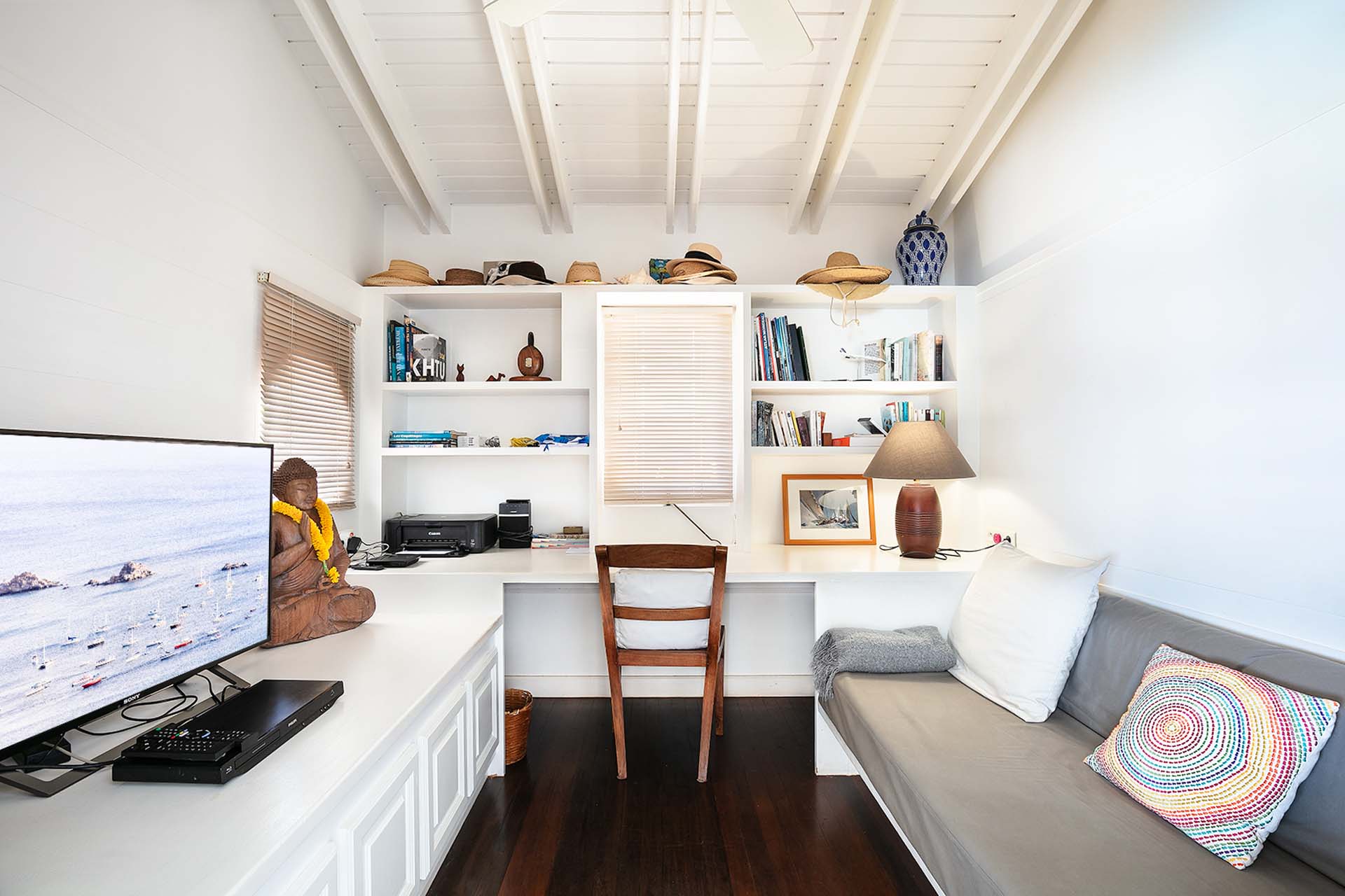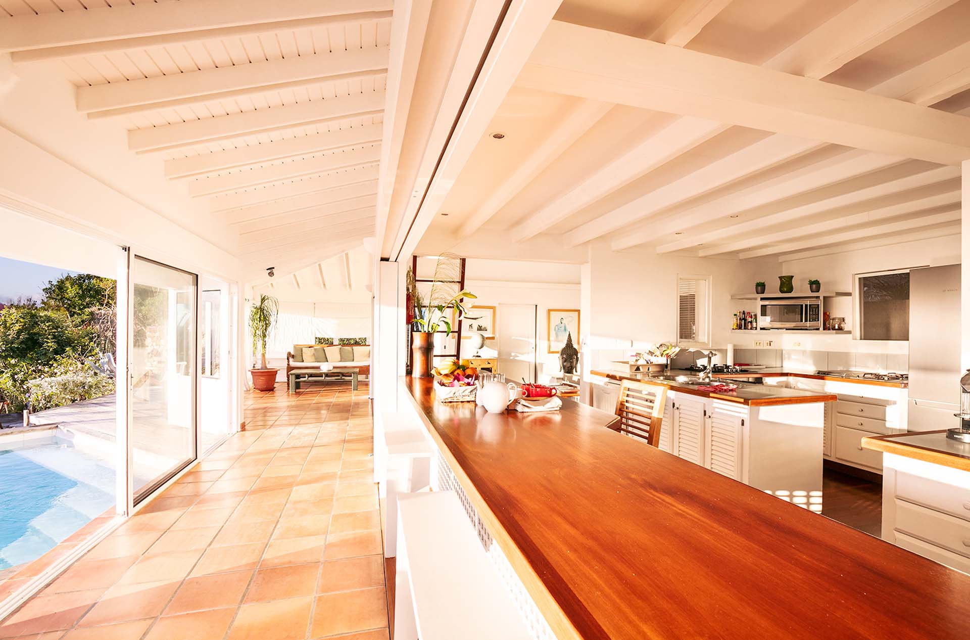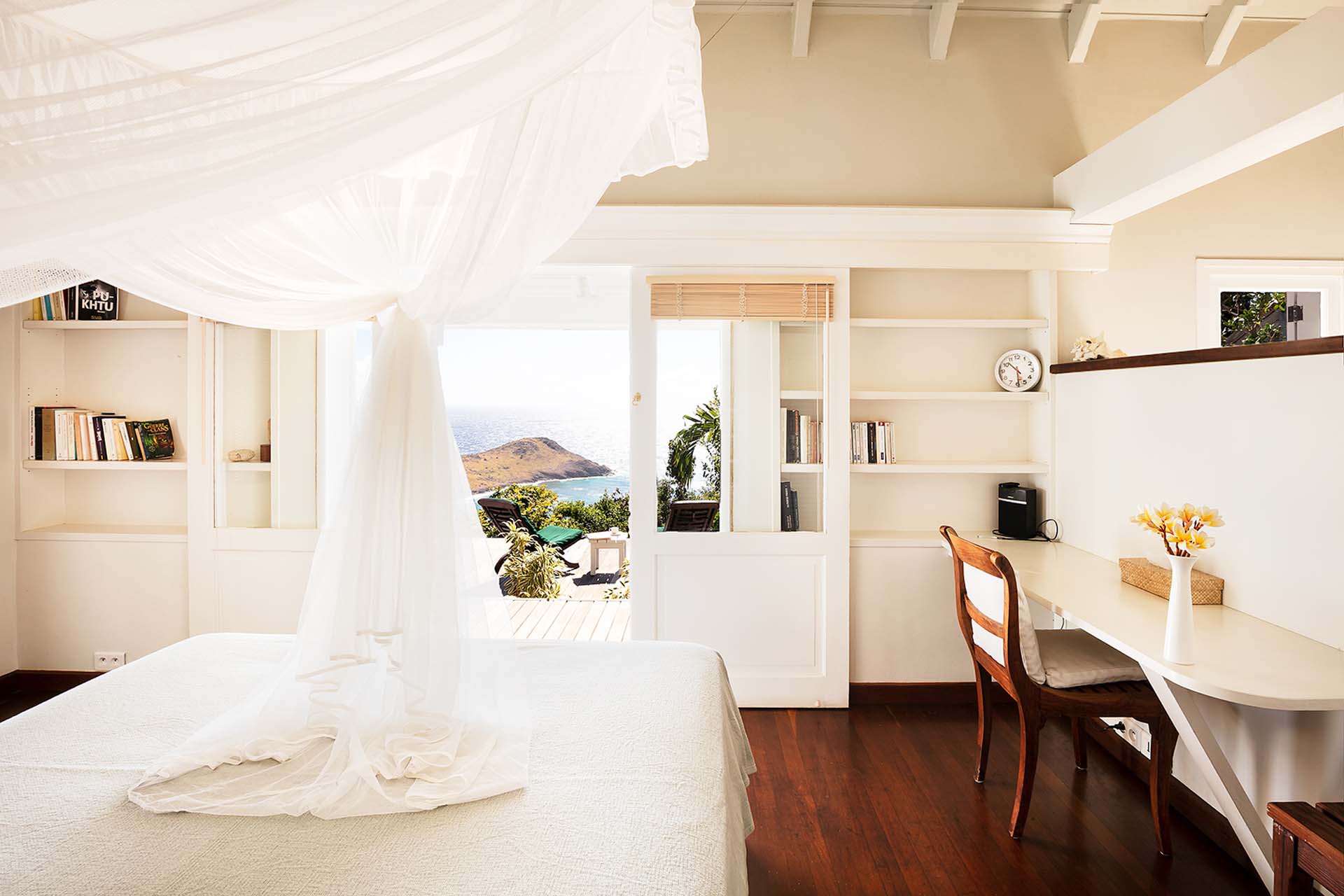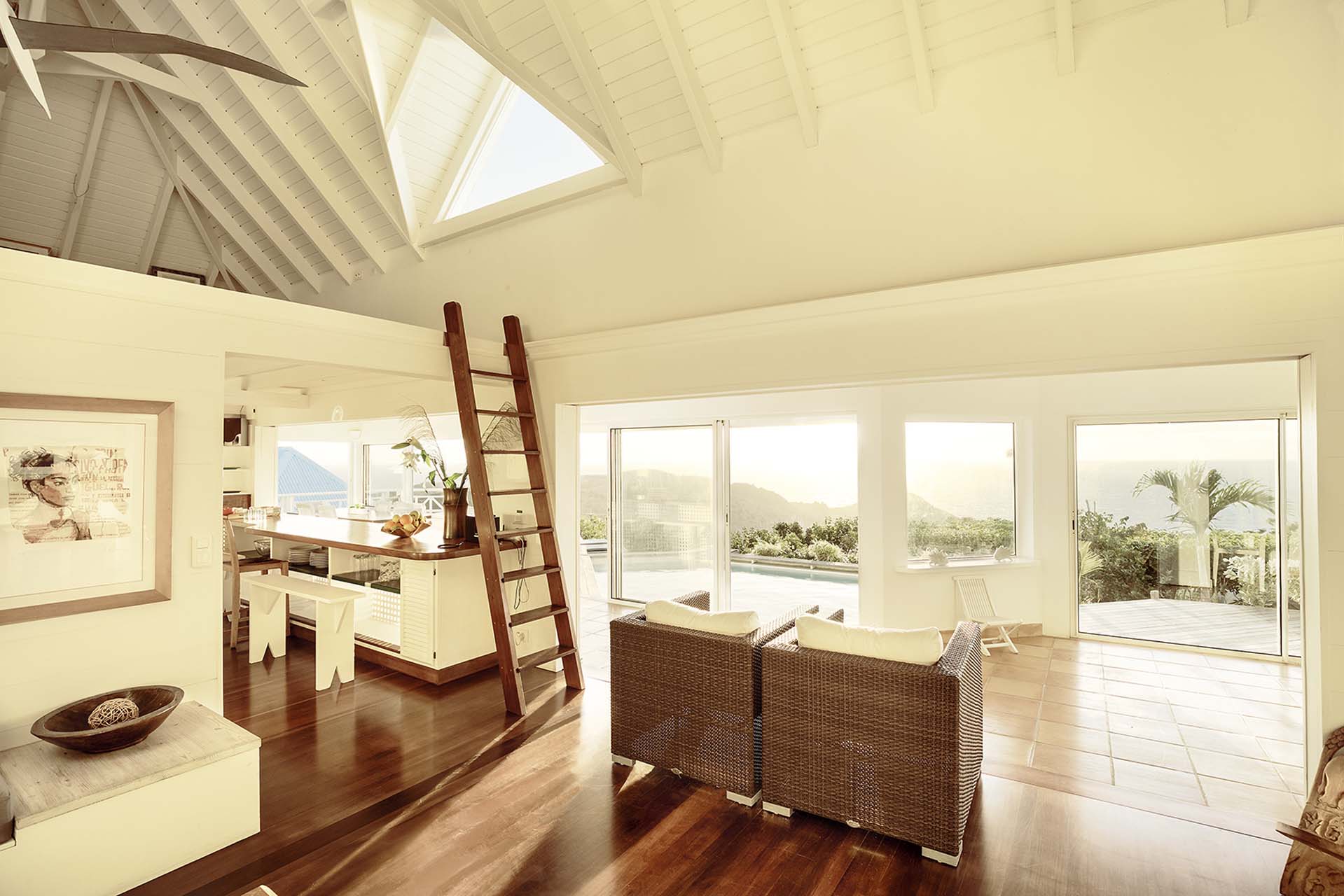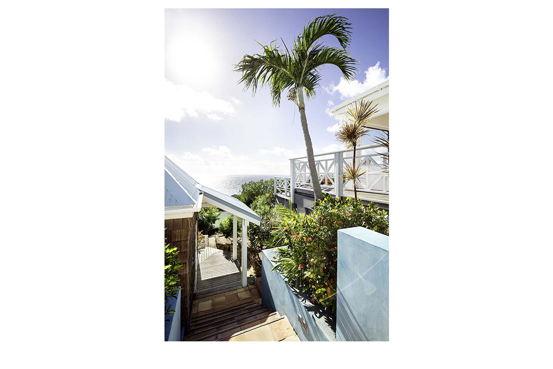 A l’architecture créole, elle se compose de trois bungalows. Le premier avec le salon, la cuisine et un petit bureau, le deuxième et troisième abritent chacun une chambres et une salle de bain.