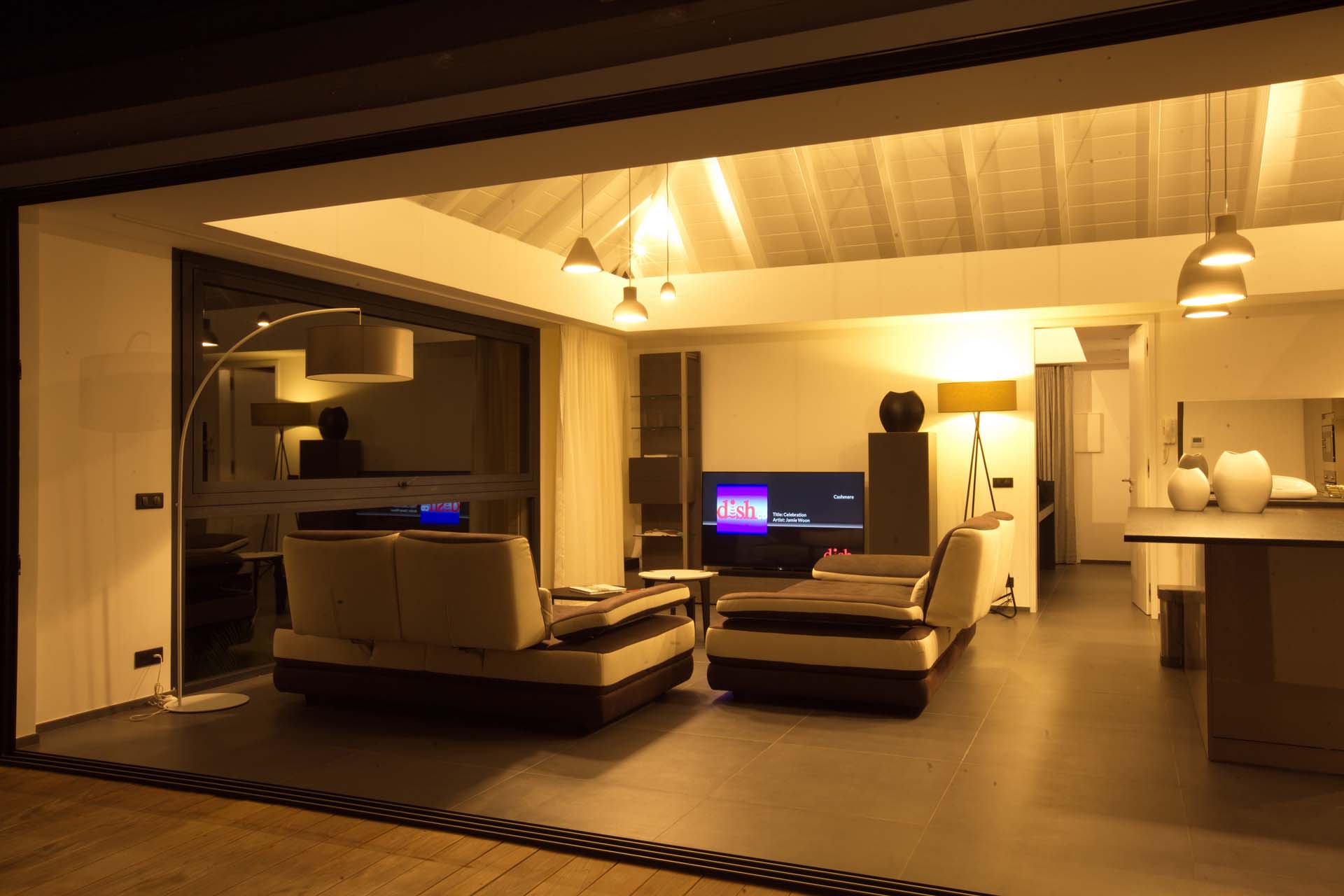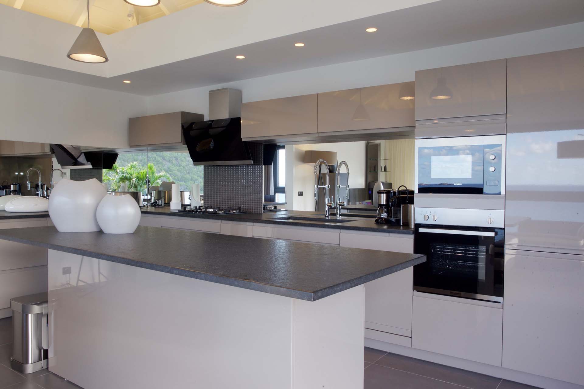 Dans un style très moderne, cette villa entièrement climatisée offre une superbe vue sur la baie de Flamands, l’océan et les îles de Saint Martin et d’Anguilla.
