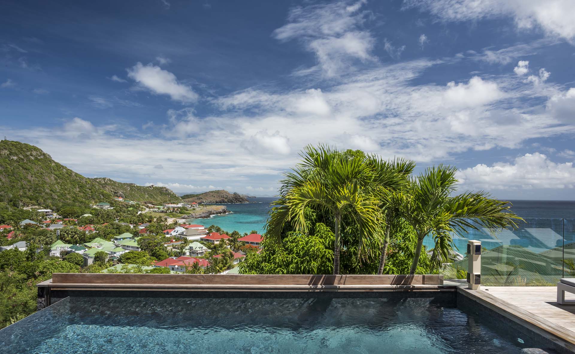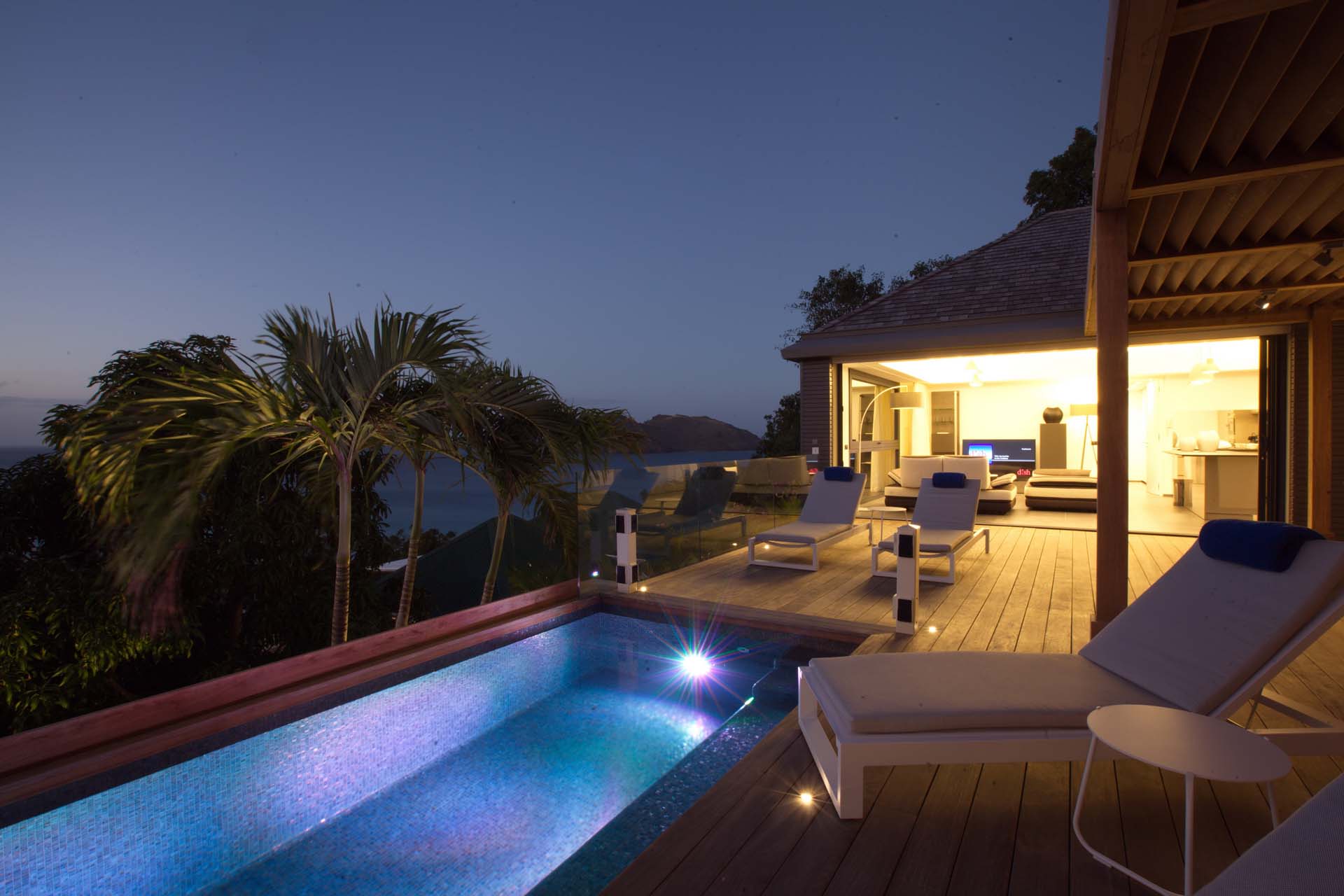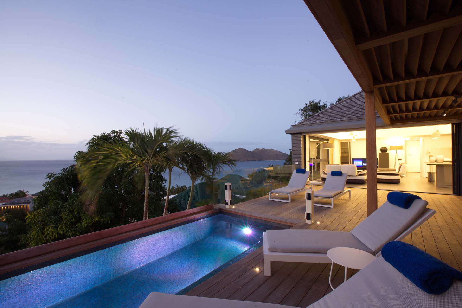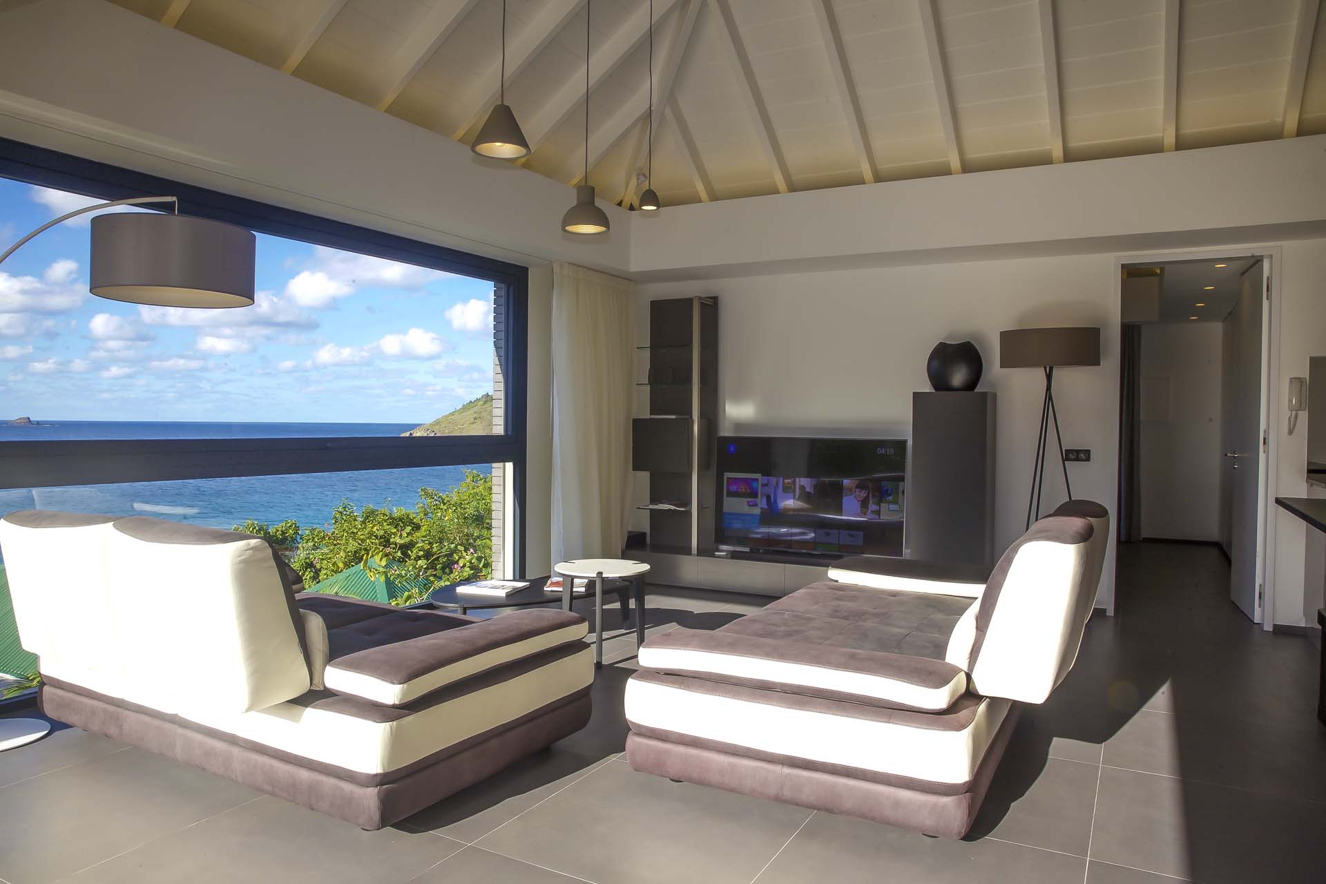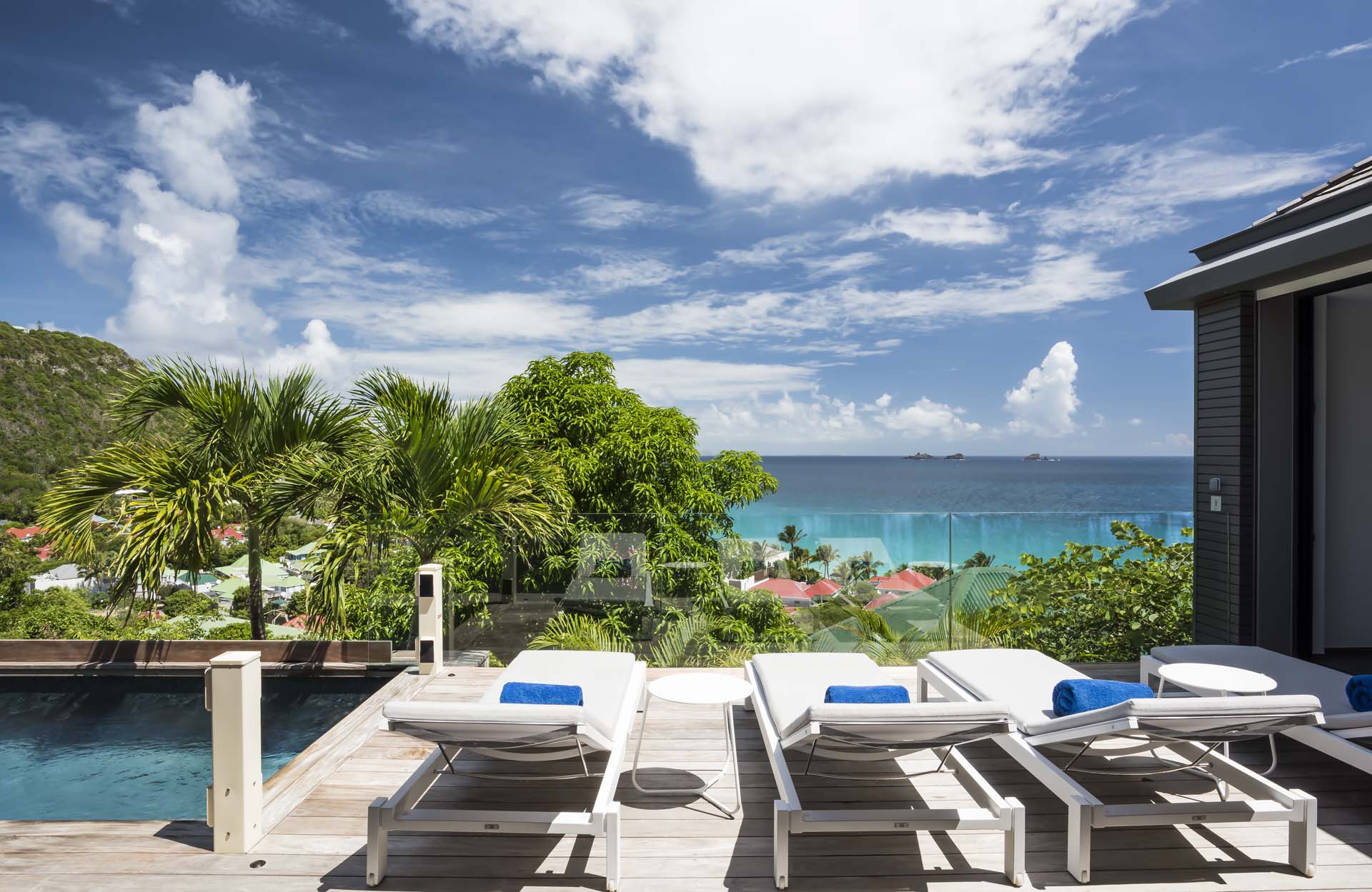 Dans un style très moderne, cette villa entièrement climatisée offre une superbe vue sur la baie de Flamands, l’océan et les îles de Saint Martin et d’Anguilla.