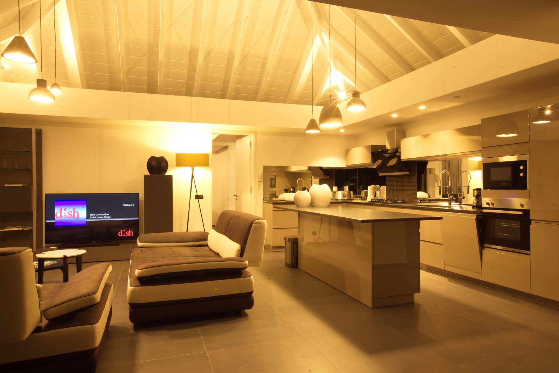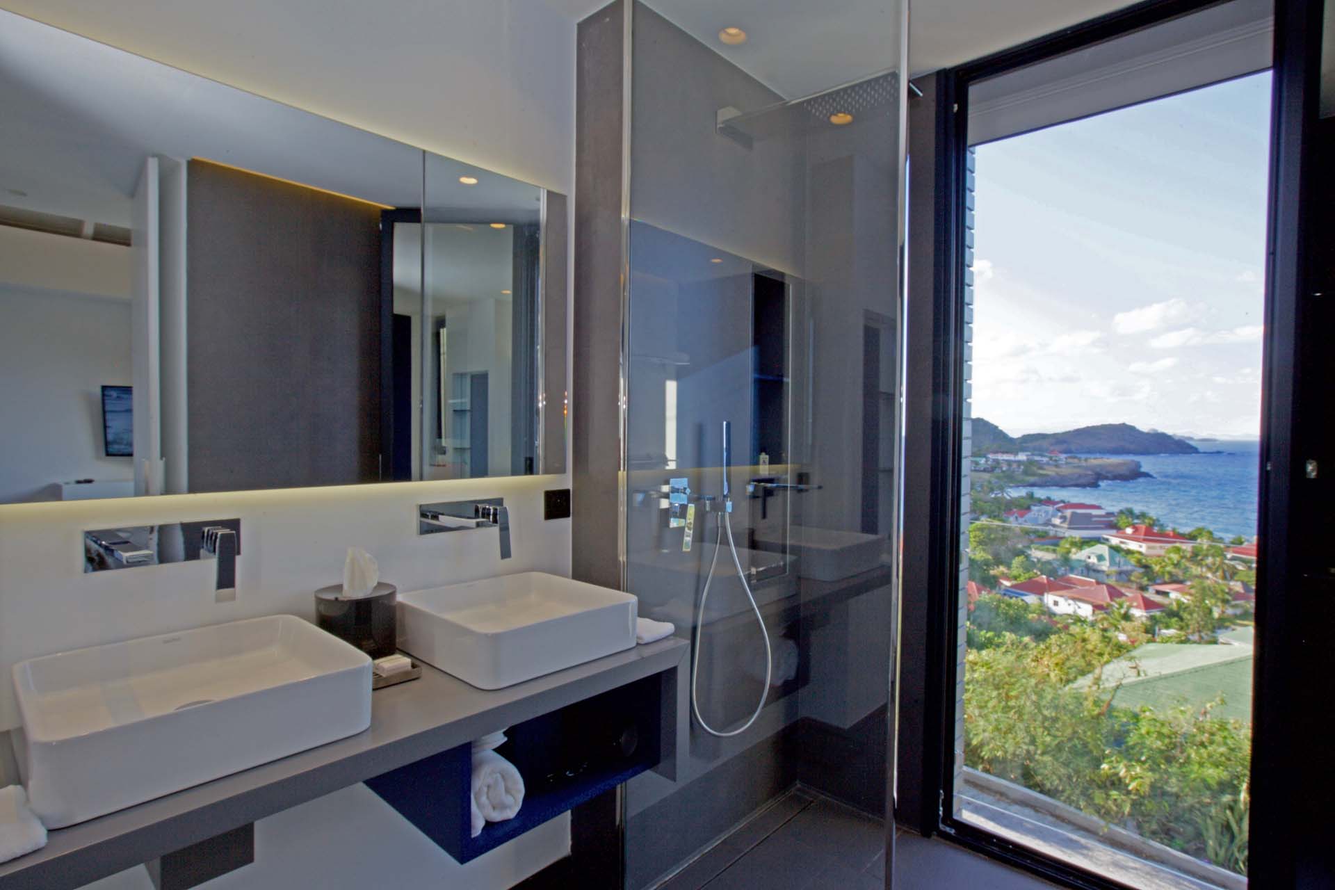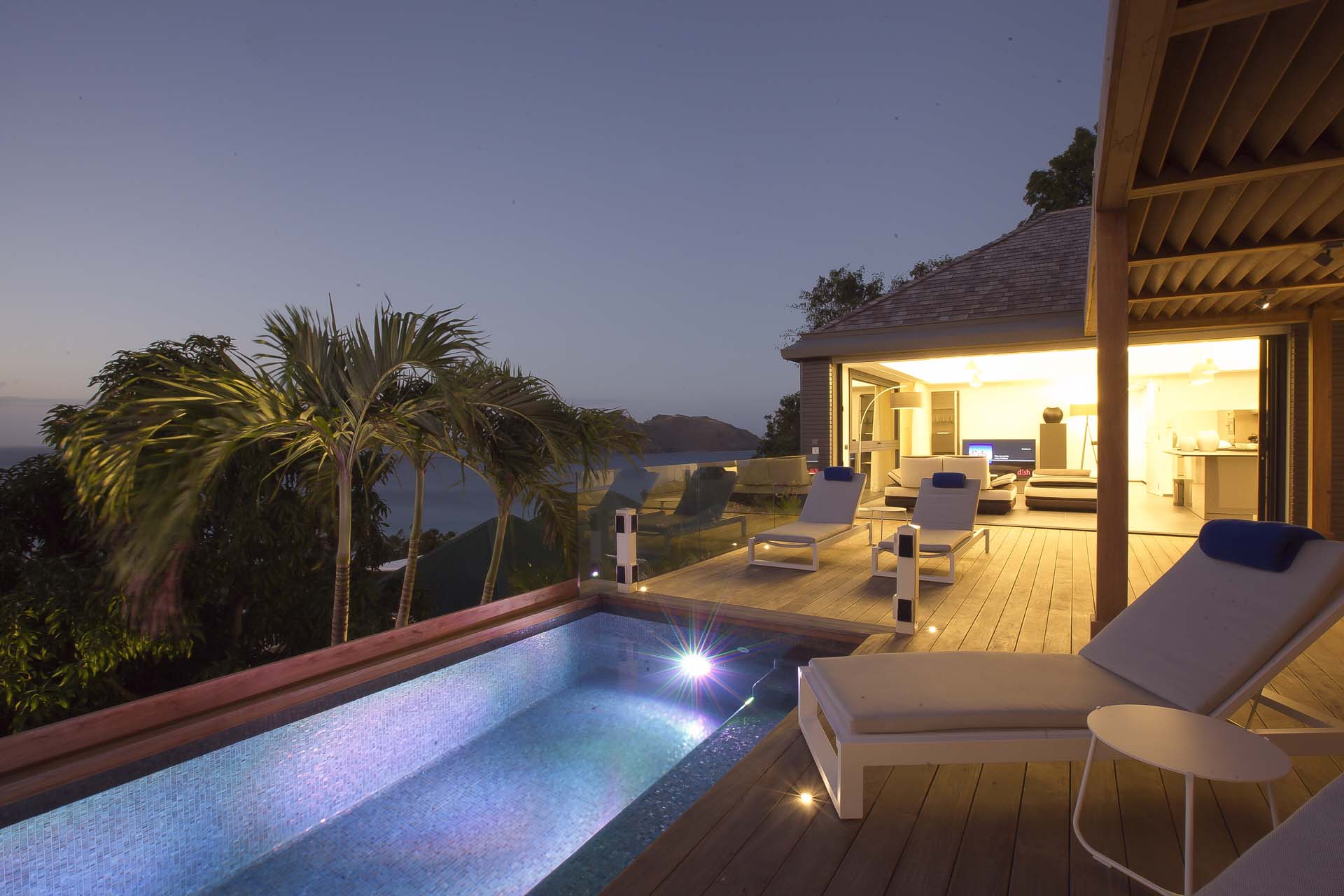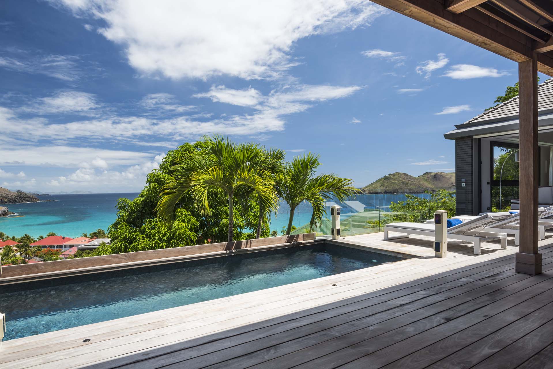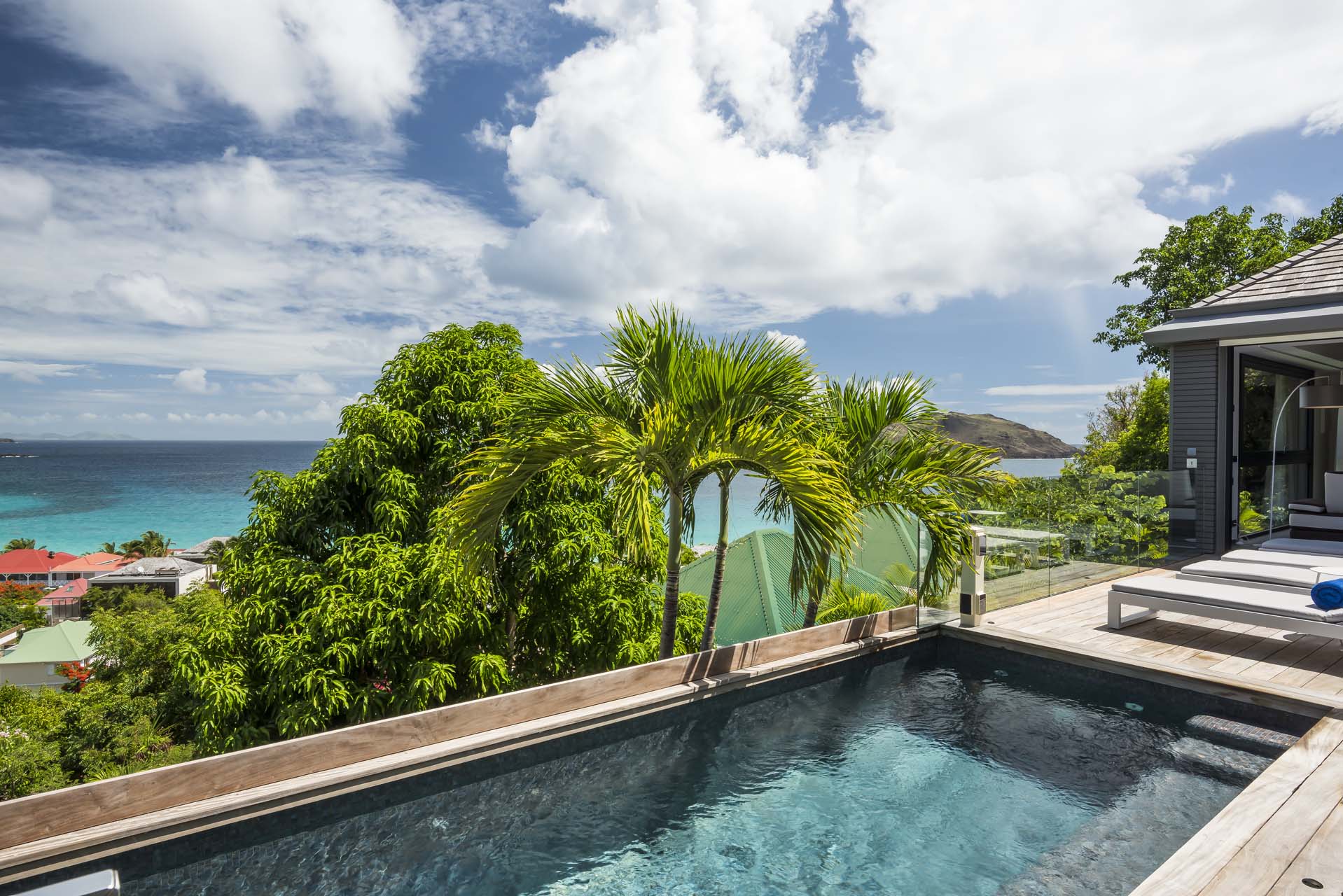 Dans un style très moderne, cette villa entièrement climatisée offre une superbe vue sur la baie de Flamands, l’océan et les îles de Saint Martin et d’Anguilla.