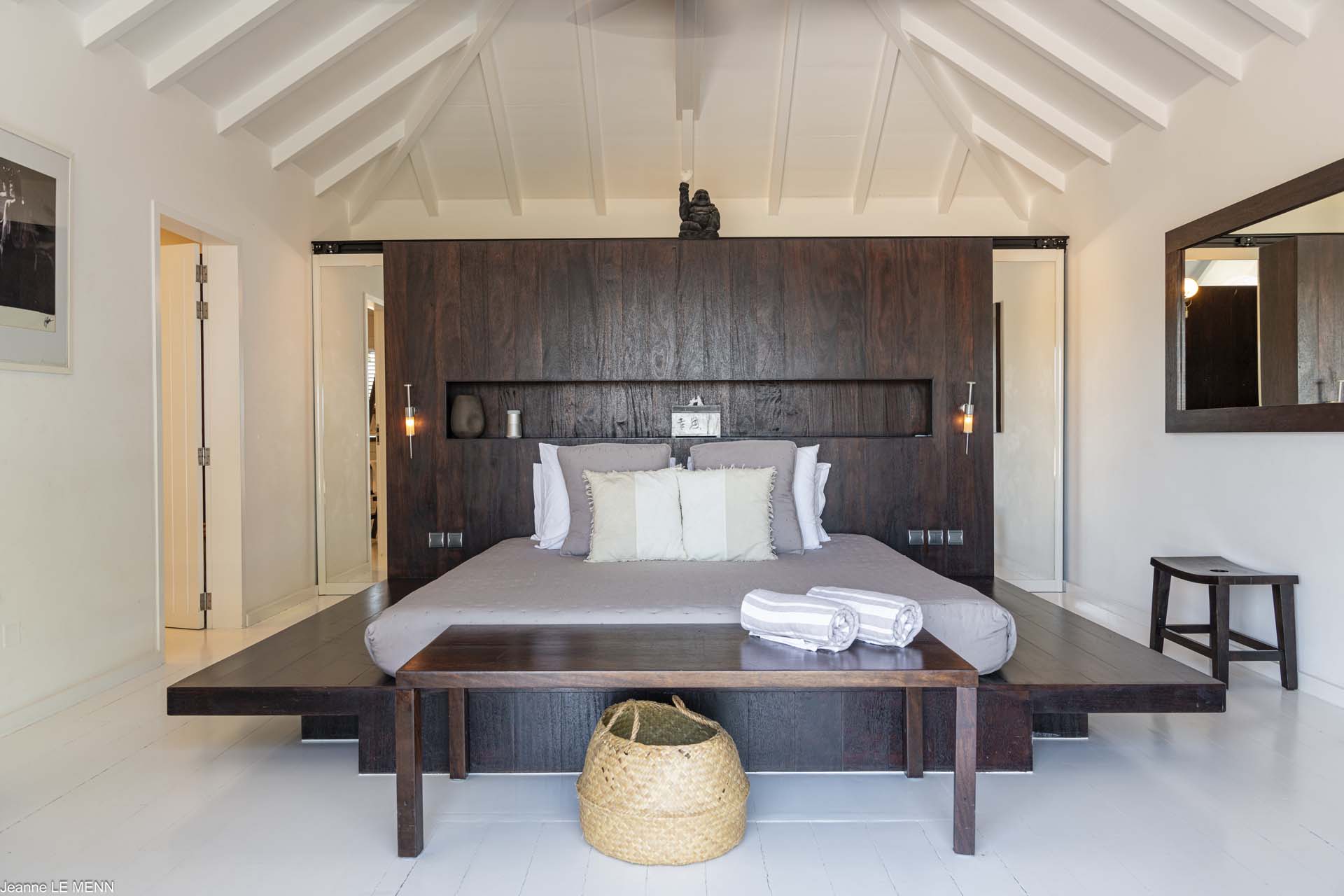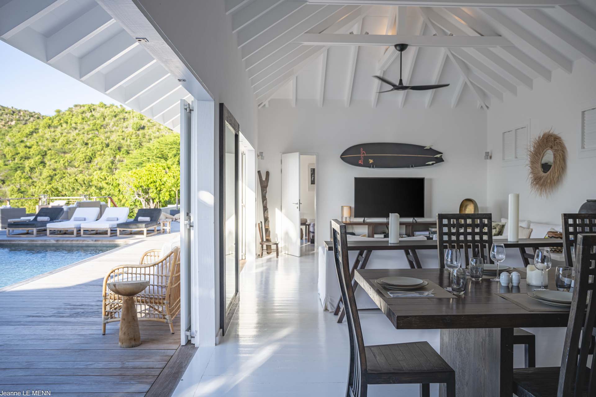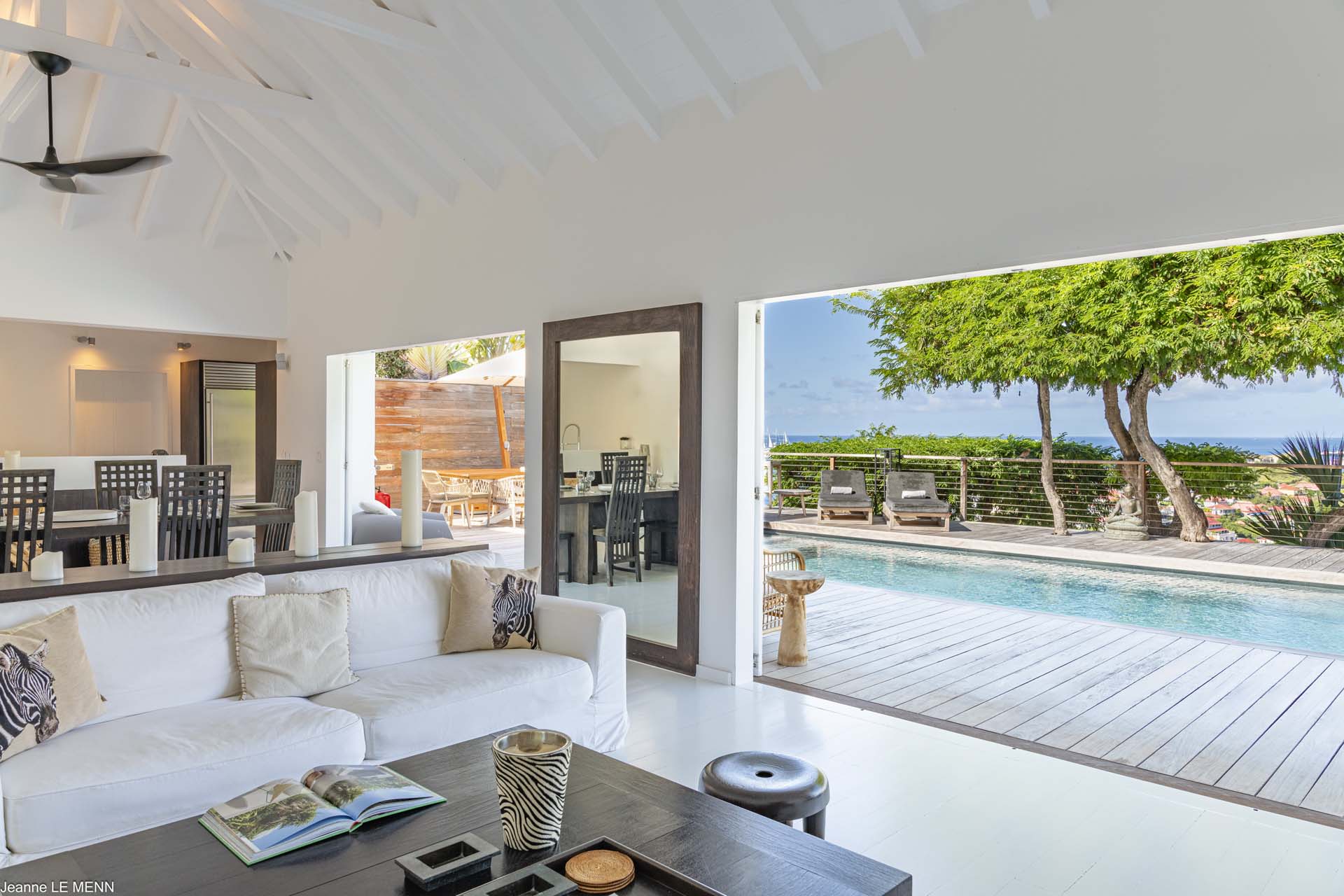Côté intérieur, une décoration épurée et sobre avec des touches exotiques a été recherchée. Le salon est très grand et s’ouvre sur le deck, la piscine et la vue sur la mer.