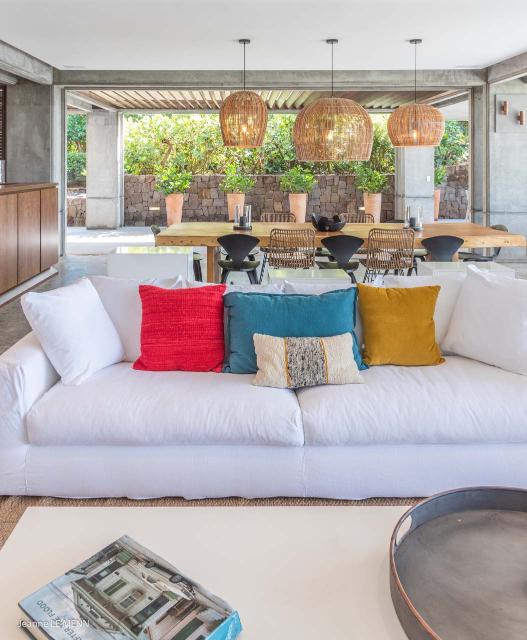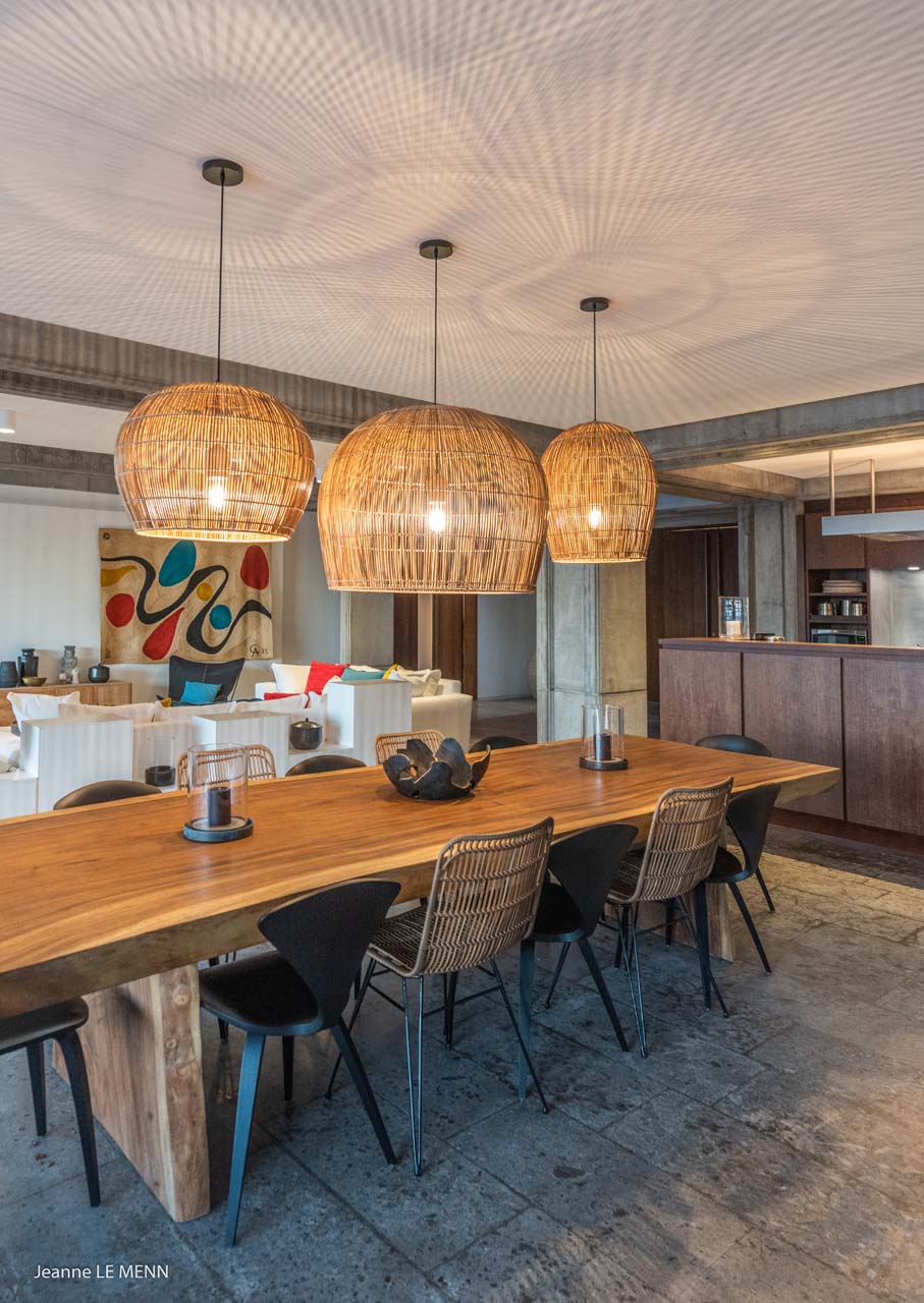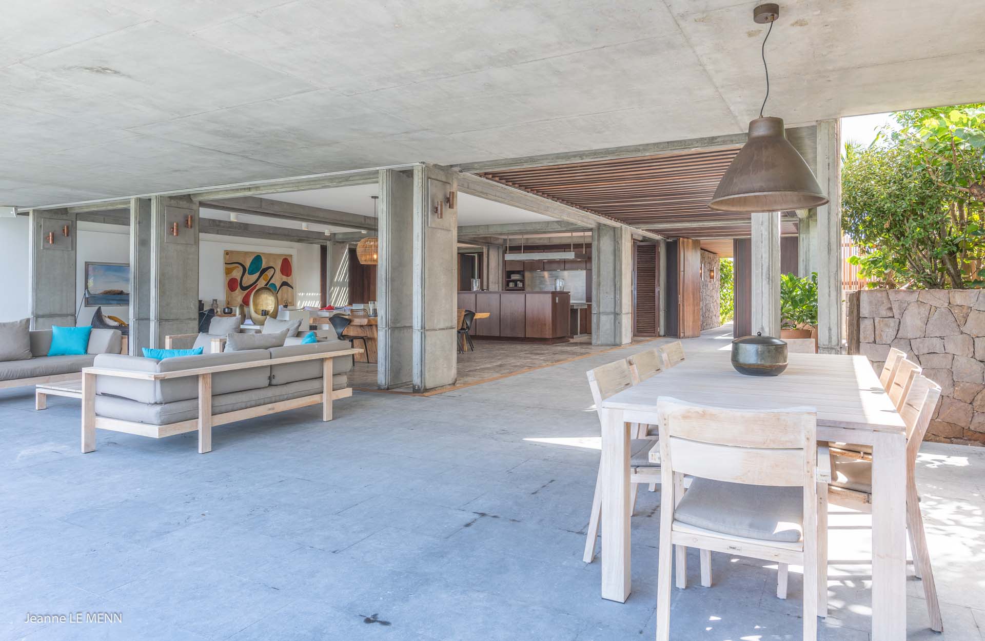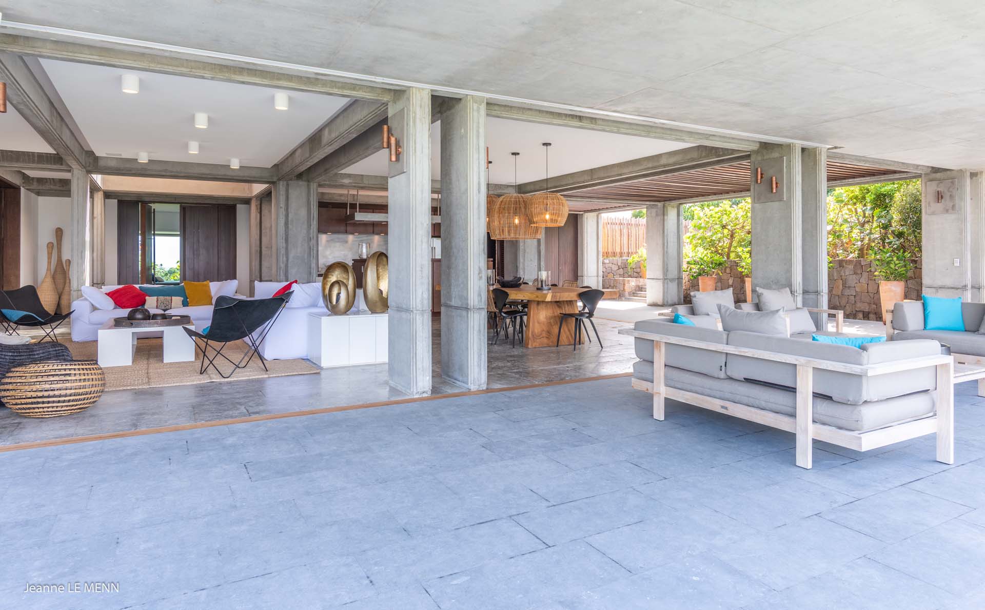 Le grand salon avec cuisine américaine s’ouvre sur l’extérieur, où l’on trouve des espaces lounge spacieux et une magnifique piscine à débordement.