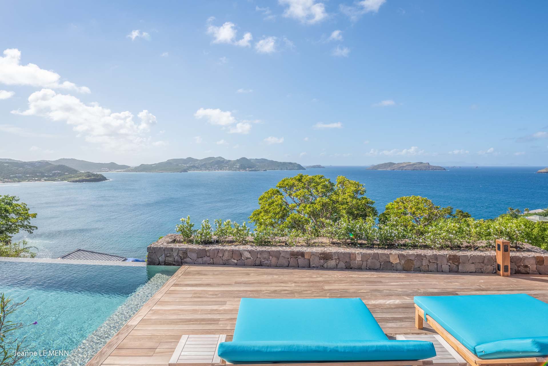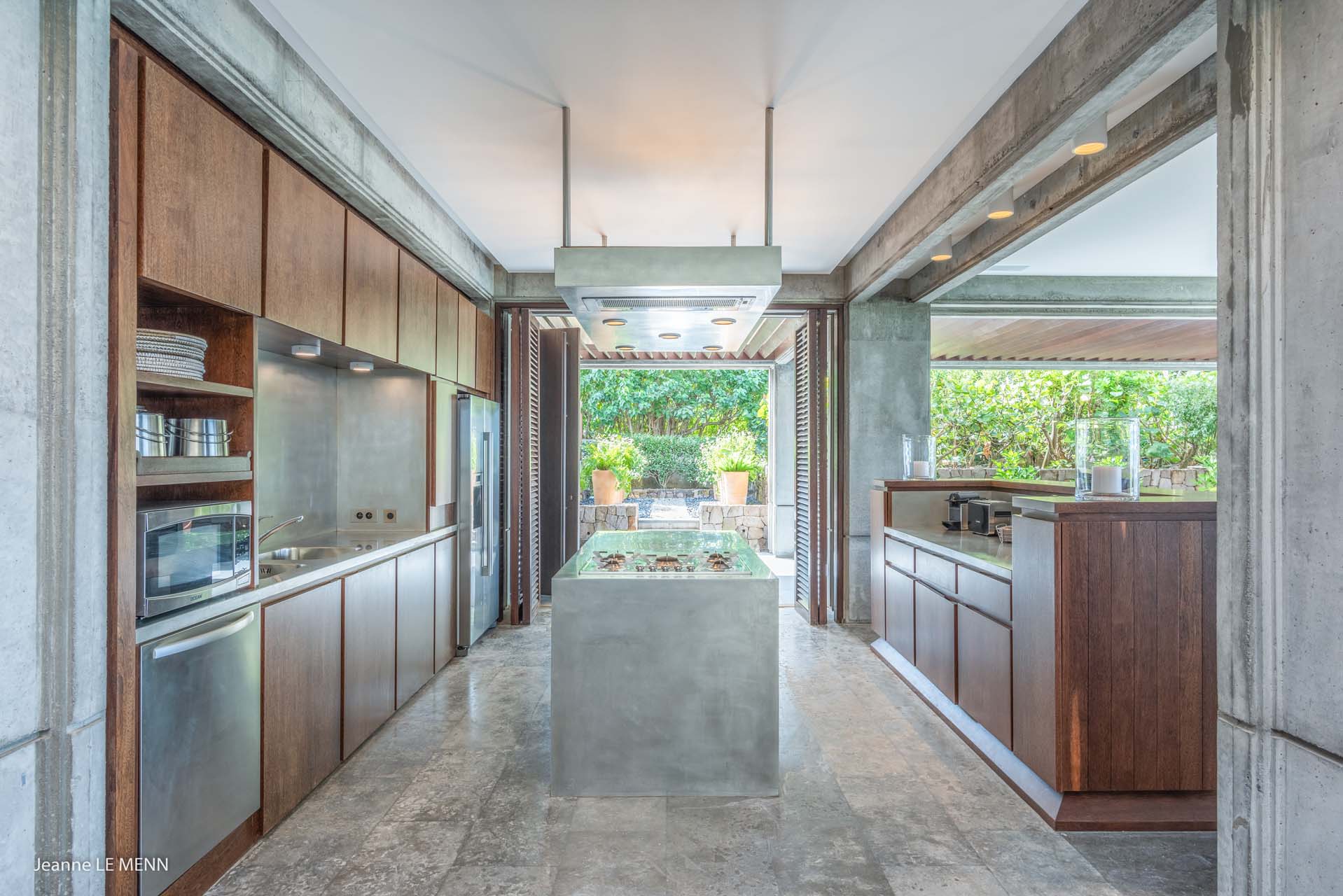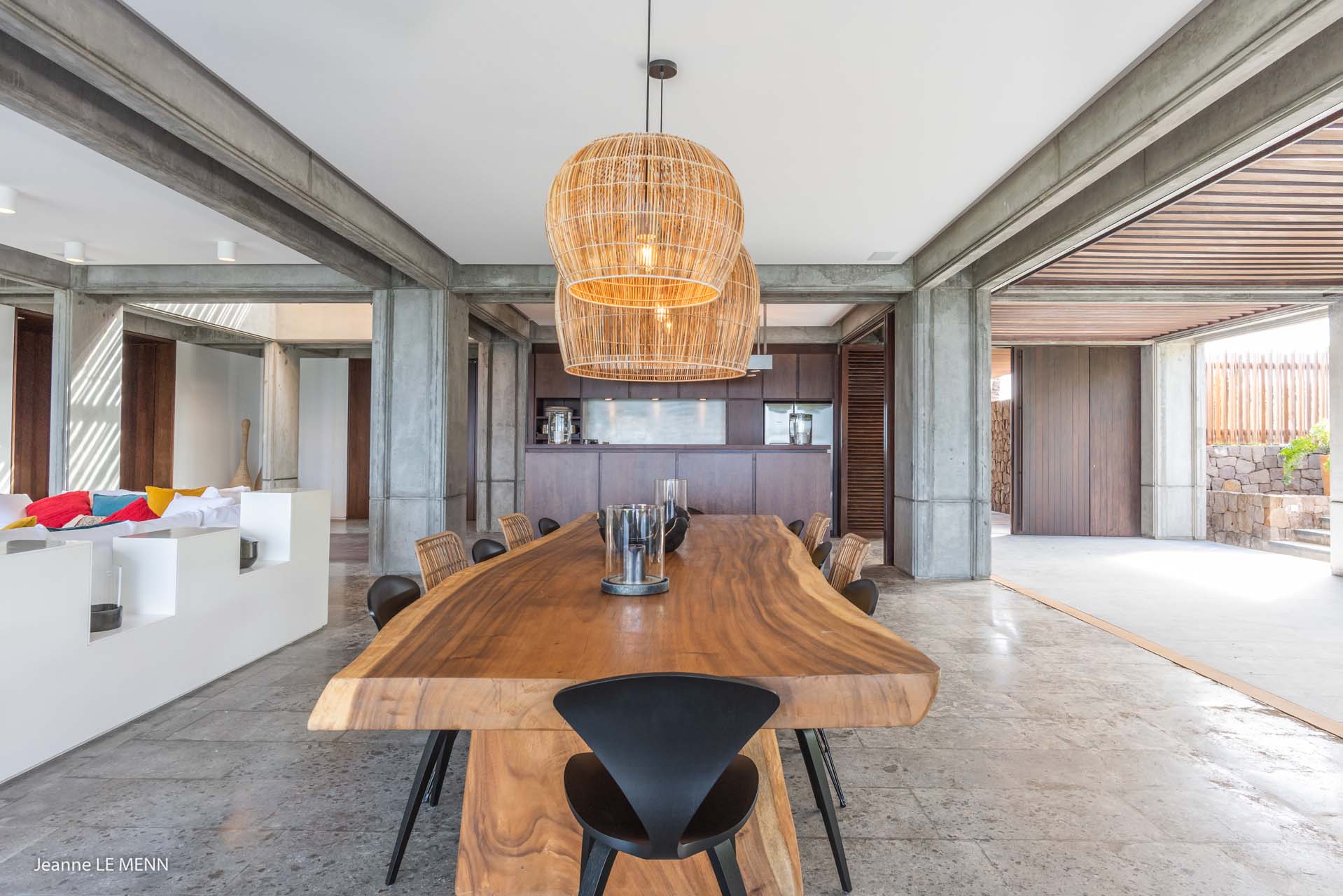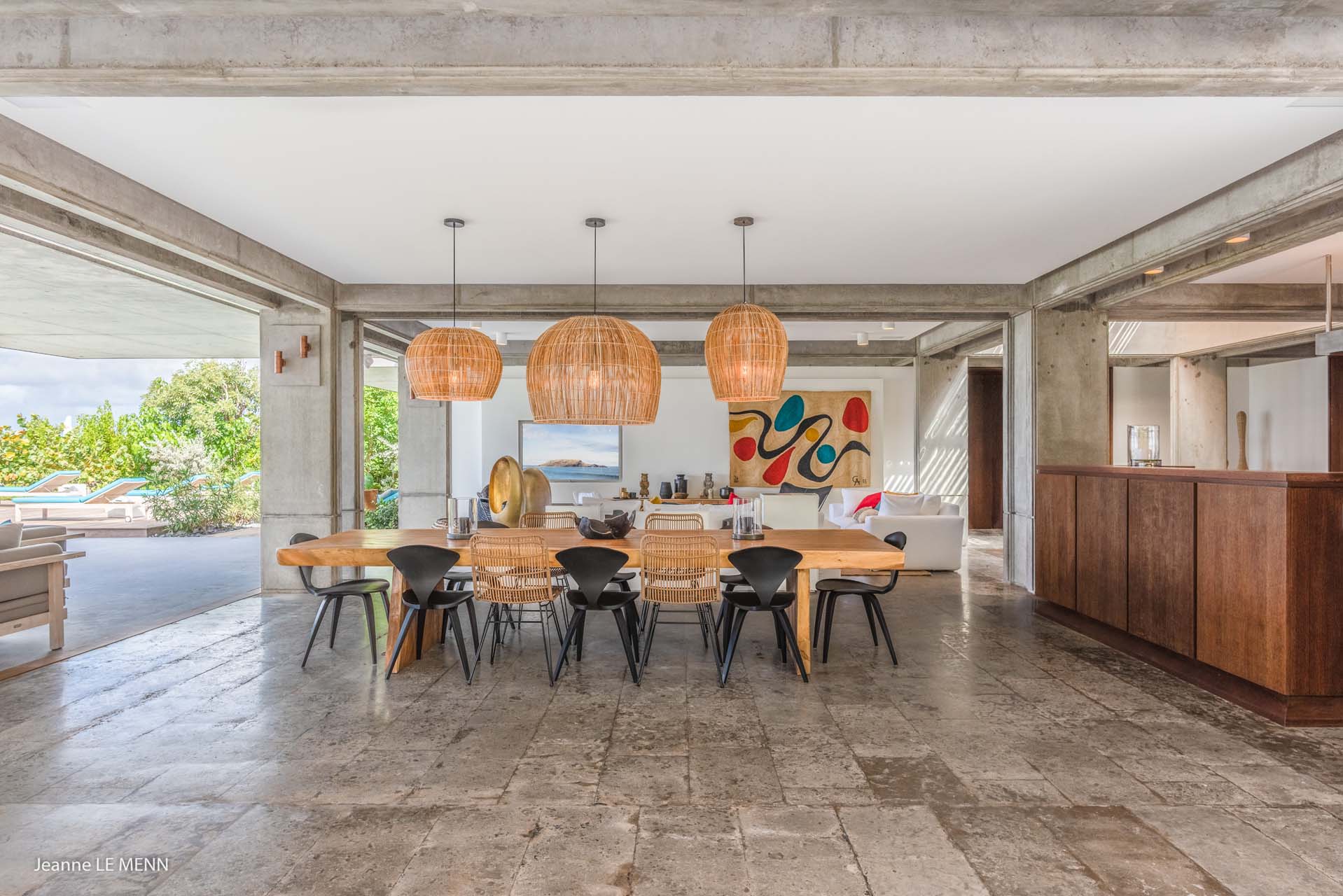 Le grand salon avec cuisine américaine s’ouvre sur l’extérieur, où l’on trouve des espaces lounge spacieux et une magnifique piscine à débordement.