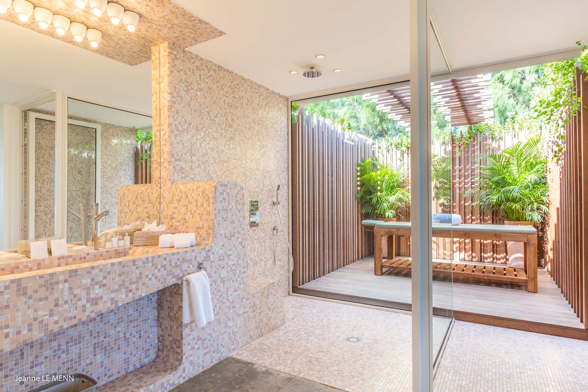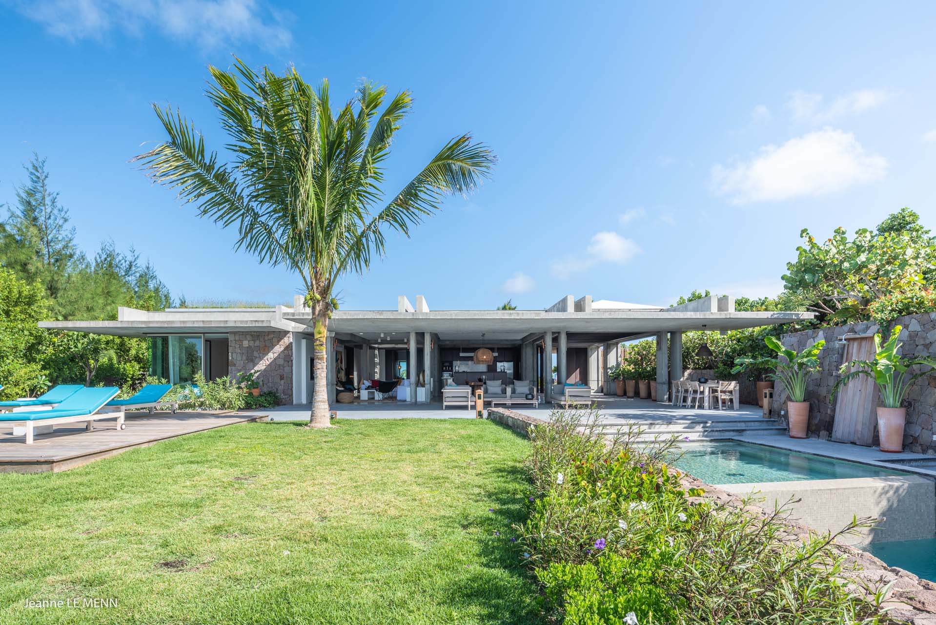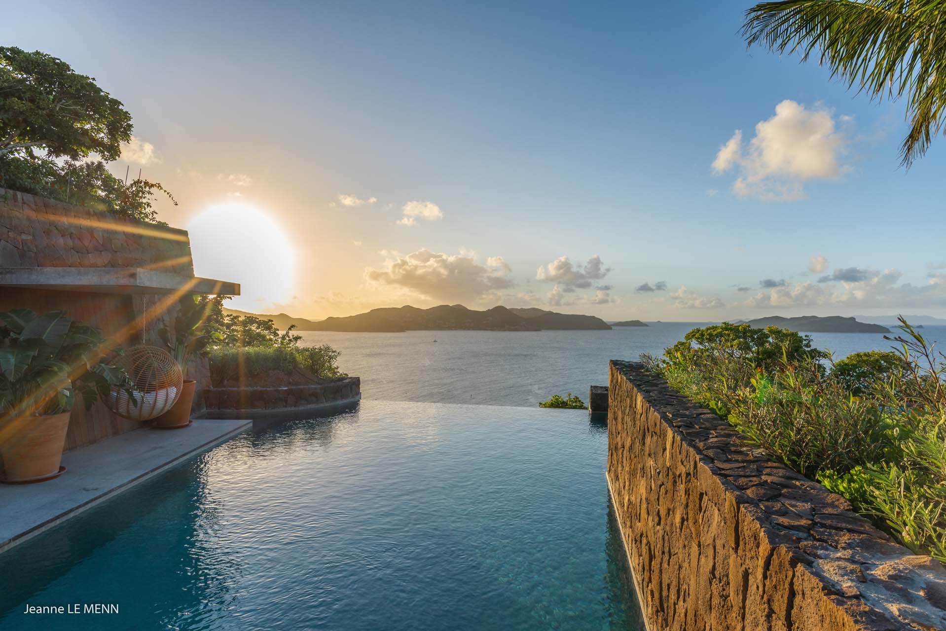 Le grand salon avec cuisine américaine s’ouvre sur l’extérieur, où l’on trouve des espaces lounge spacieux et une magnifique piscine à débordement.