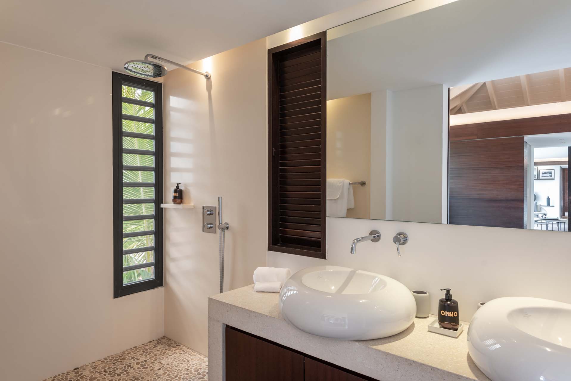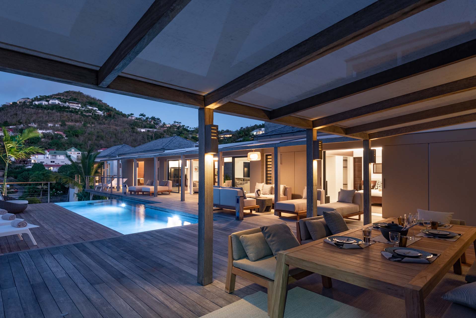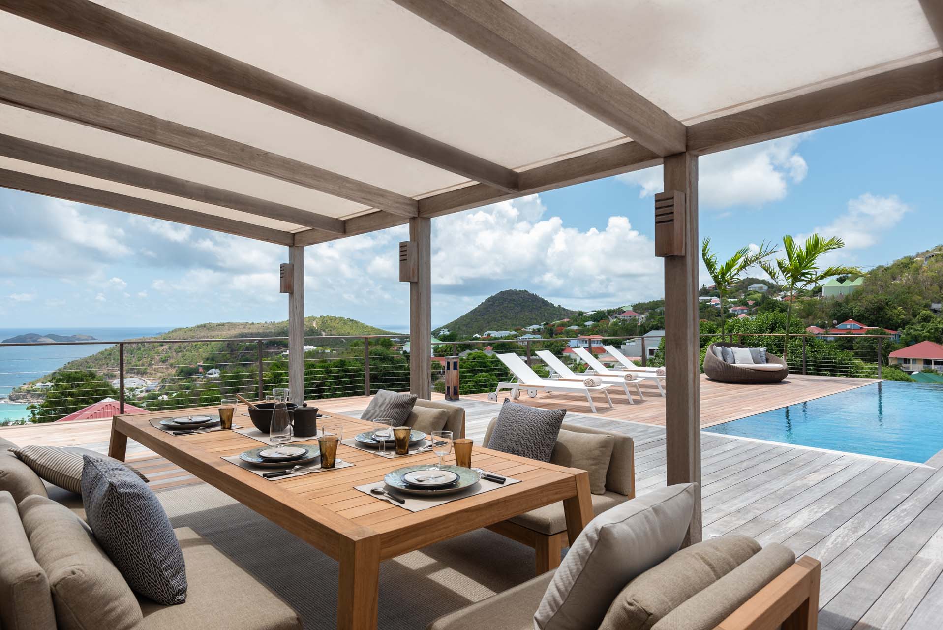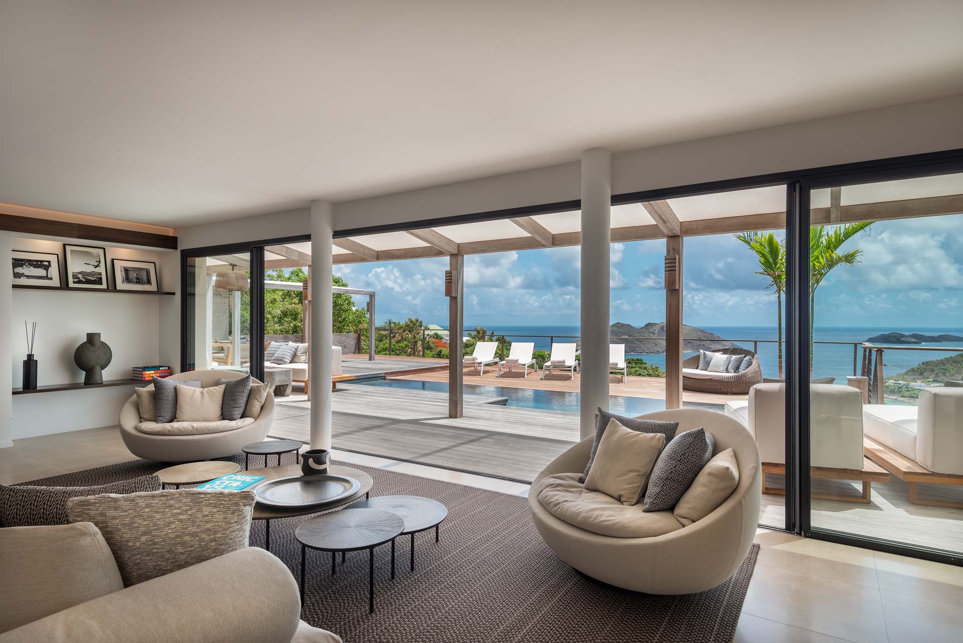 La cuisine et le salon s’ouvrent sur la terrasse, la longue piscine, les collines, l’océan et les îles.