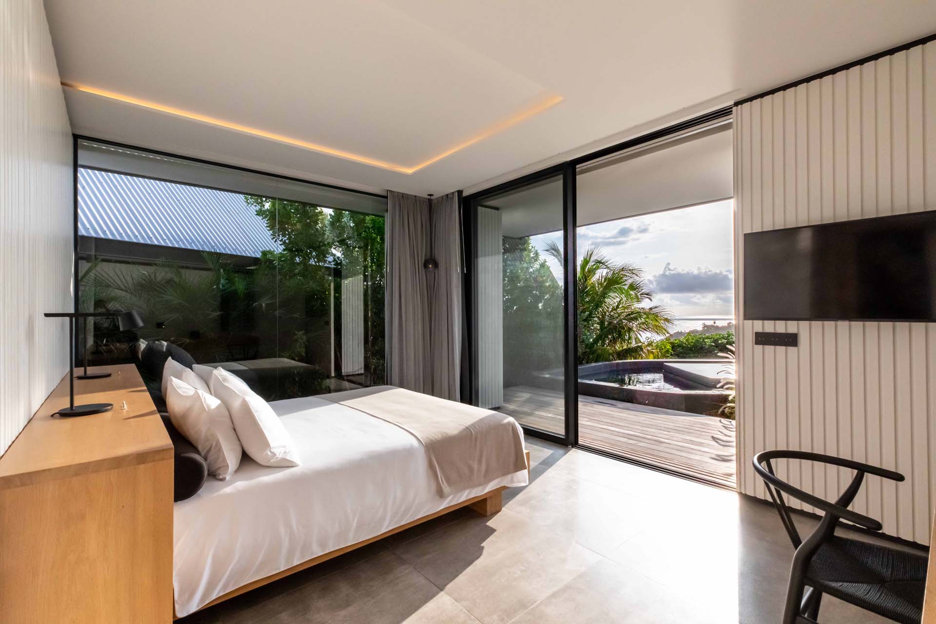 Située au niveau principal, la villa dispose de quatre chambres principales identiques avec vue et de salles de bains attenantes. À cela s’ajoutent deux chambres complémentaires: