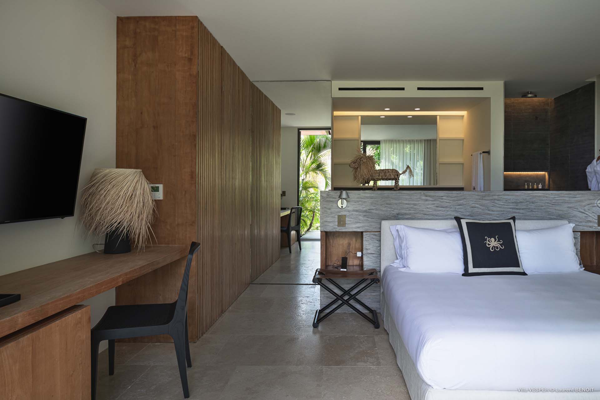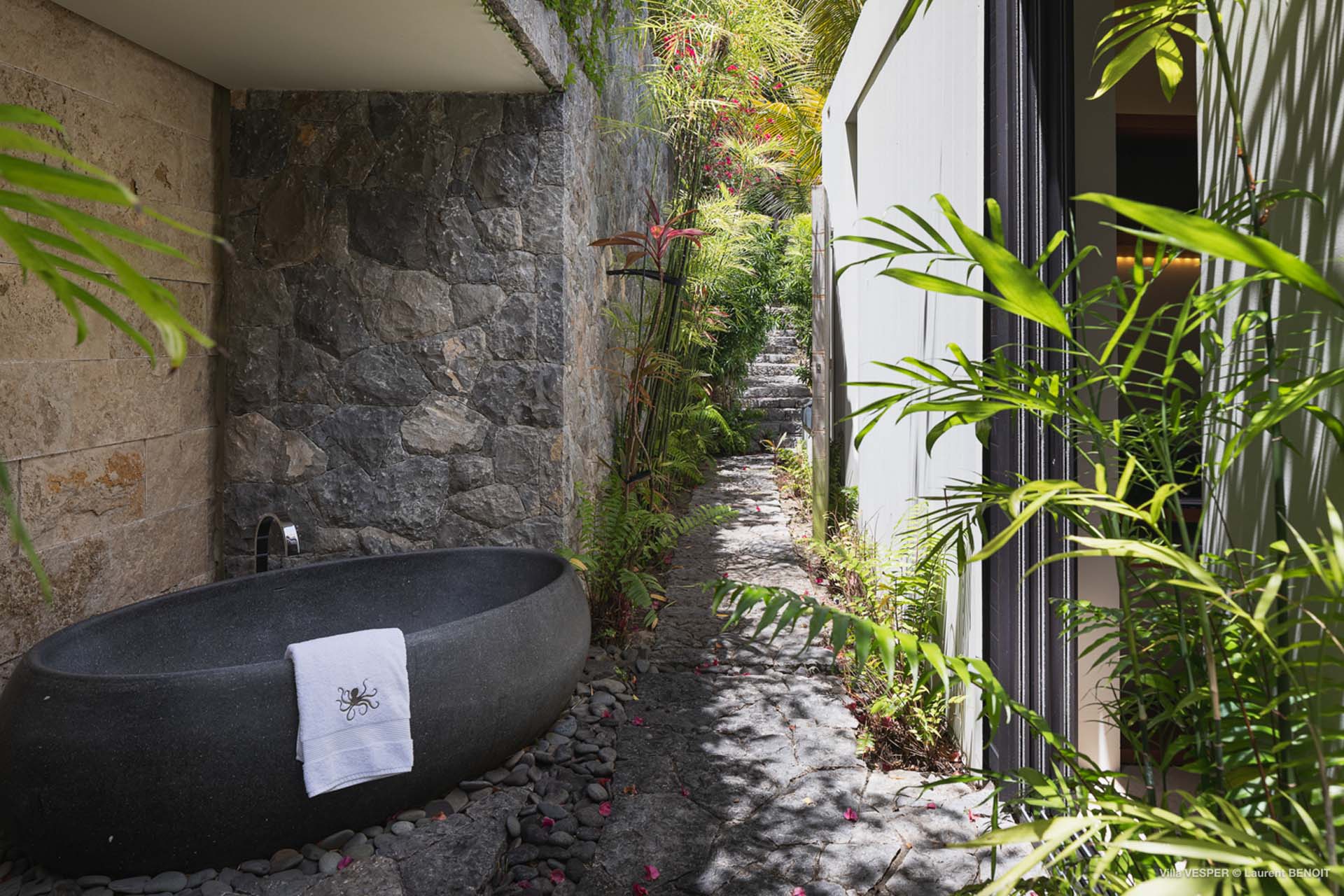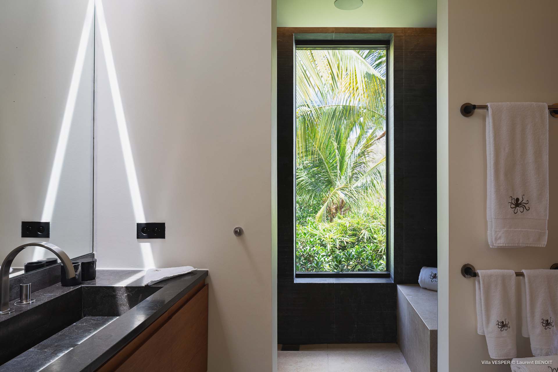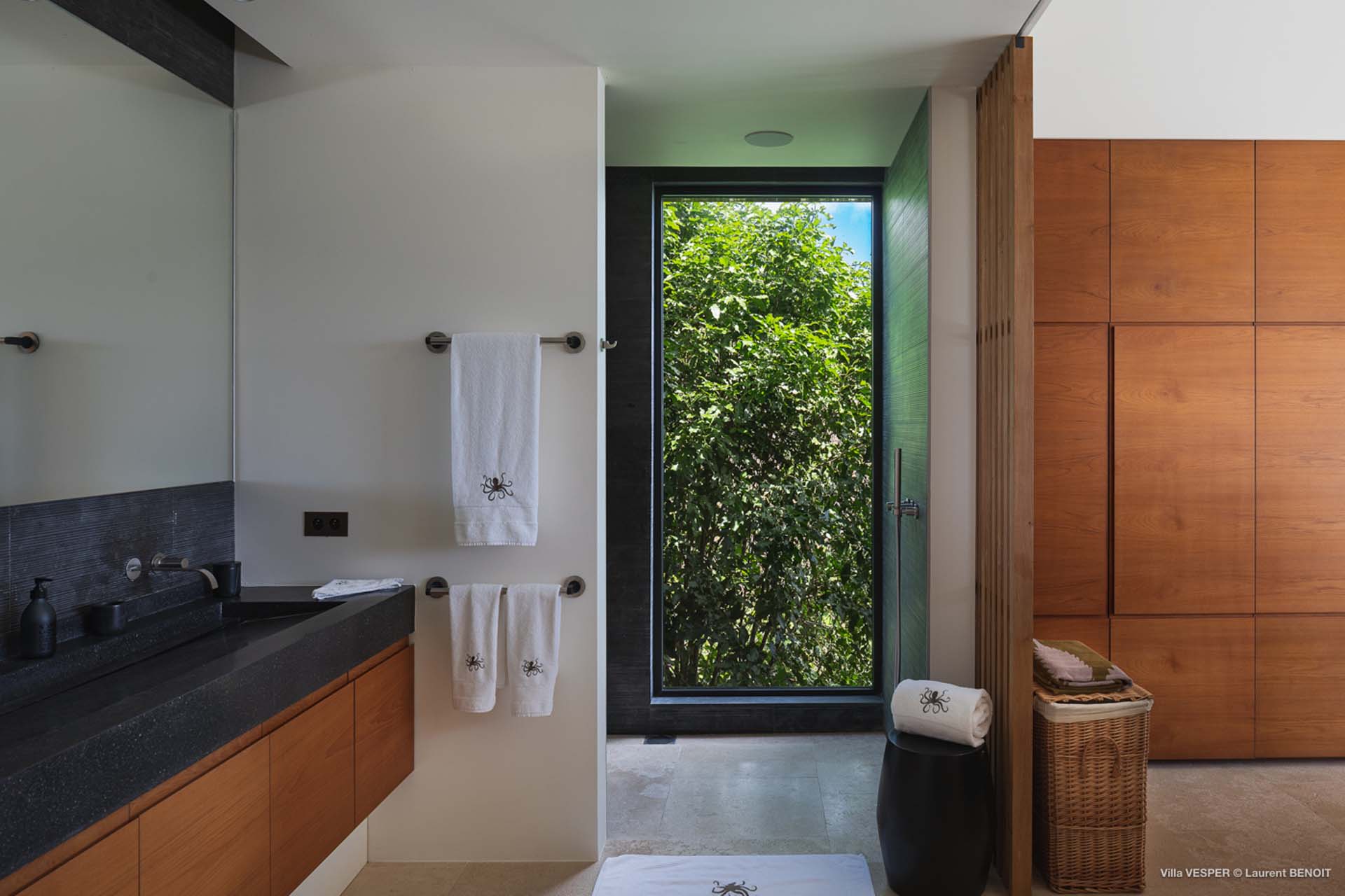 Cette villa très privée offre une vue imprenable sur la baie de Saint Jean et sur l’océan.
