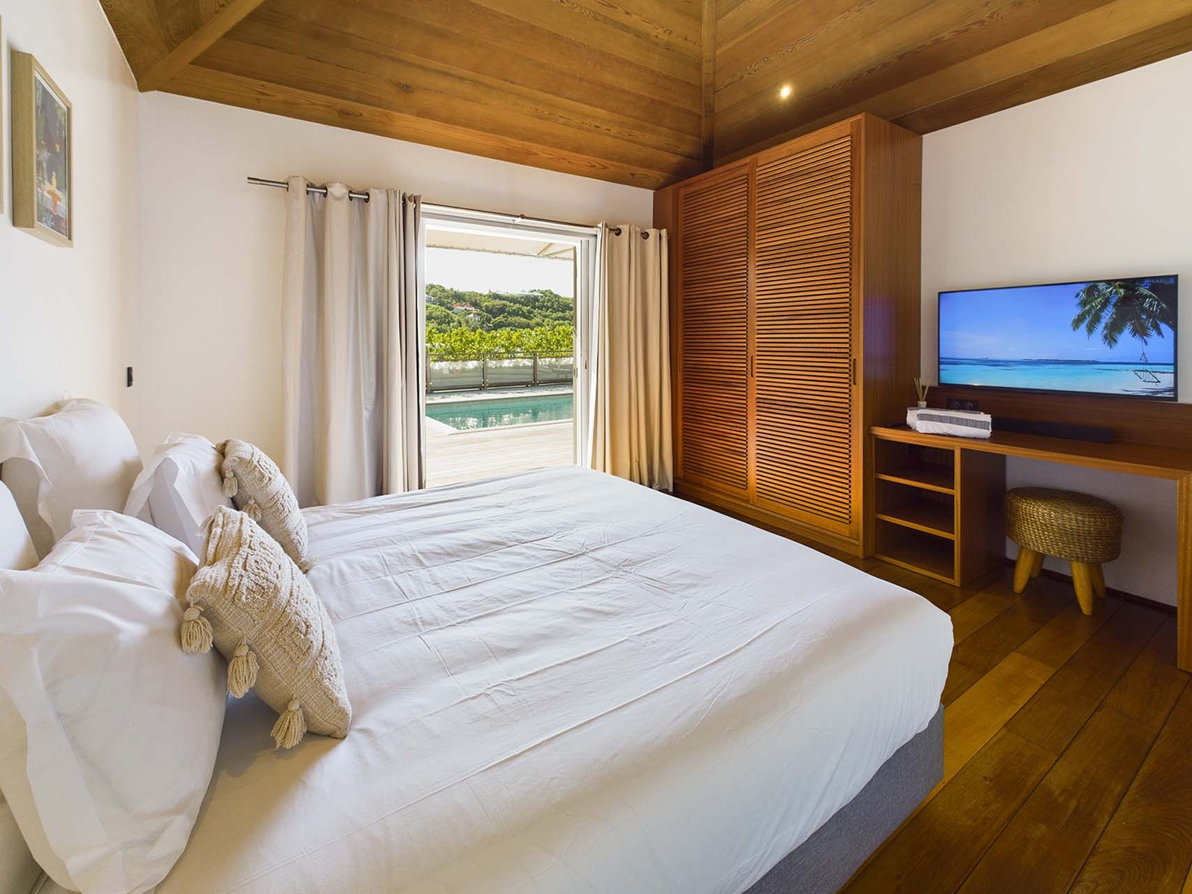 La chambre principale avec sa salle de bain attenante se trouve sur la gauche du salon. Sur le côté droit, deux autres chambres de confort équivalent font face à la piscine , l’une d’elles peut être aménagée en lits jumeaux, idéale pour des enfants ou des adolescents. Ces deux chambres partagent une salle de bain, également accessible depuis la terrasse.