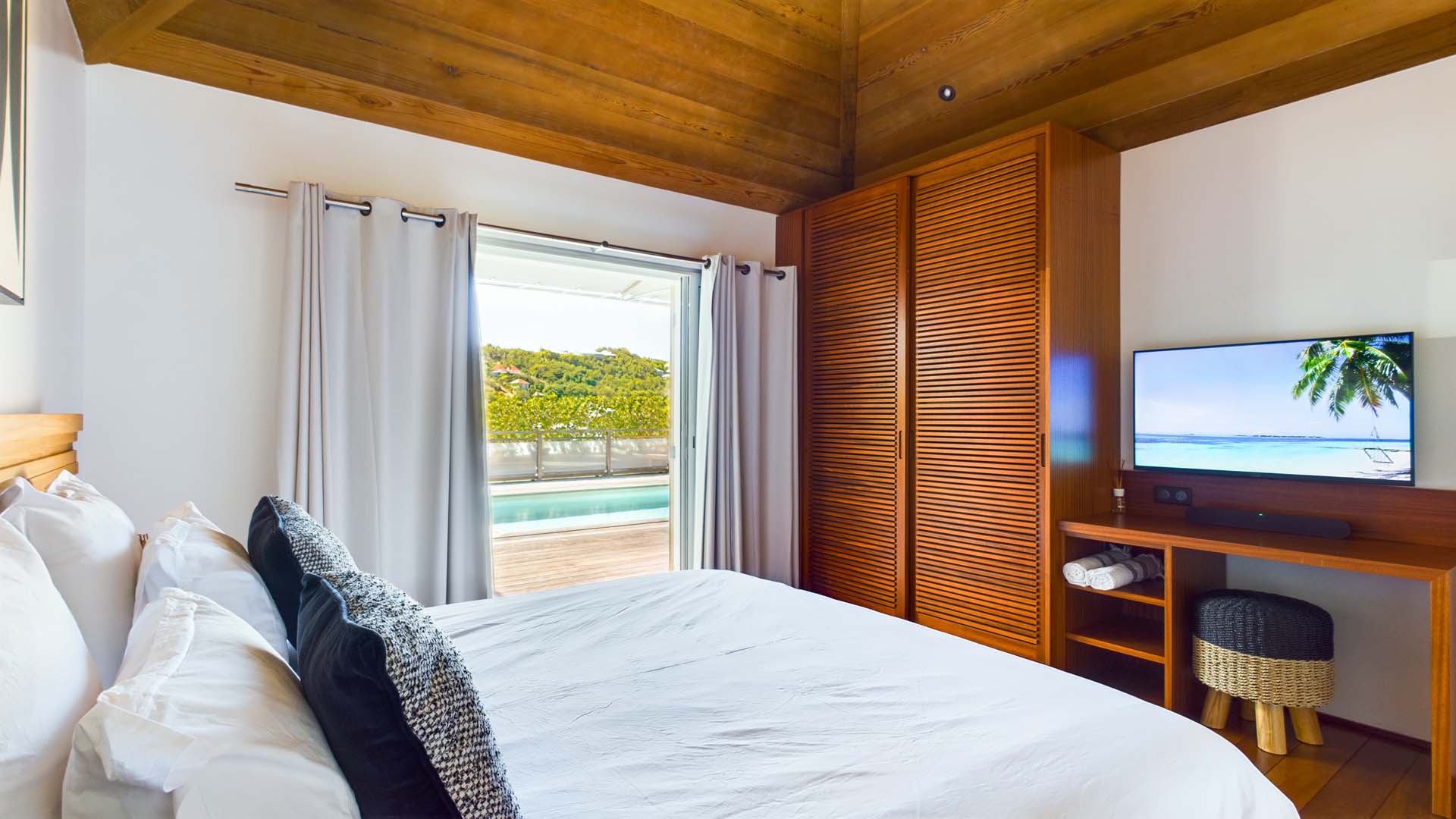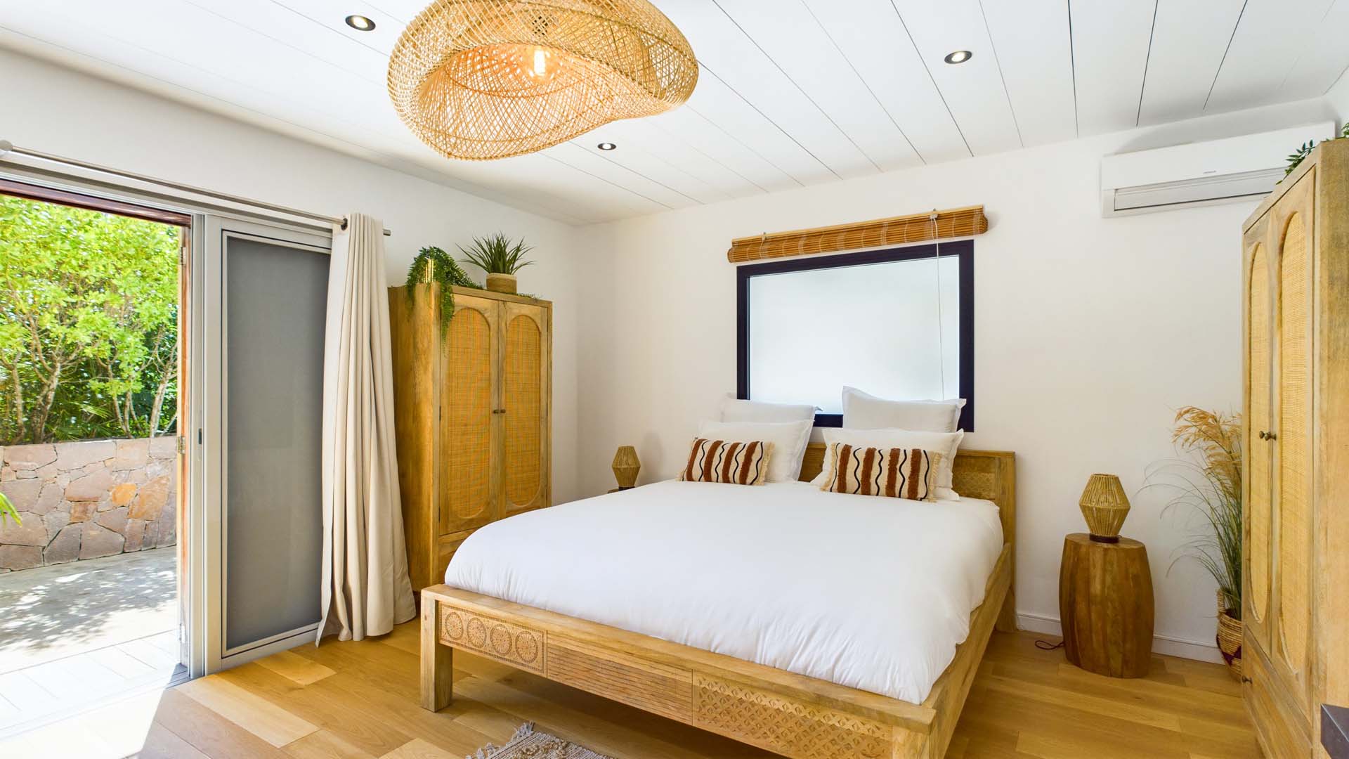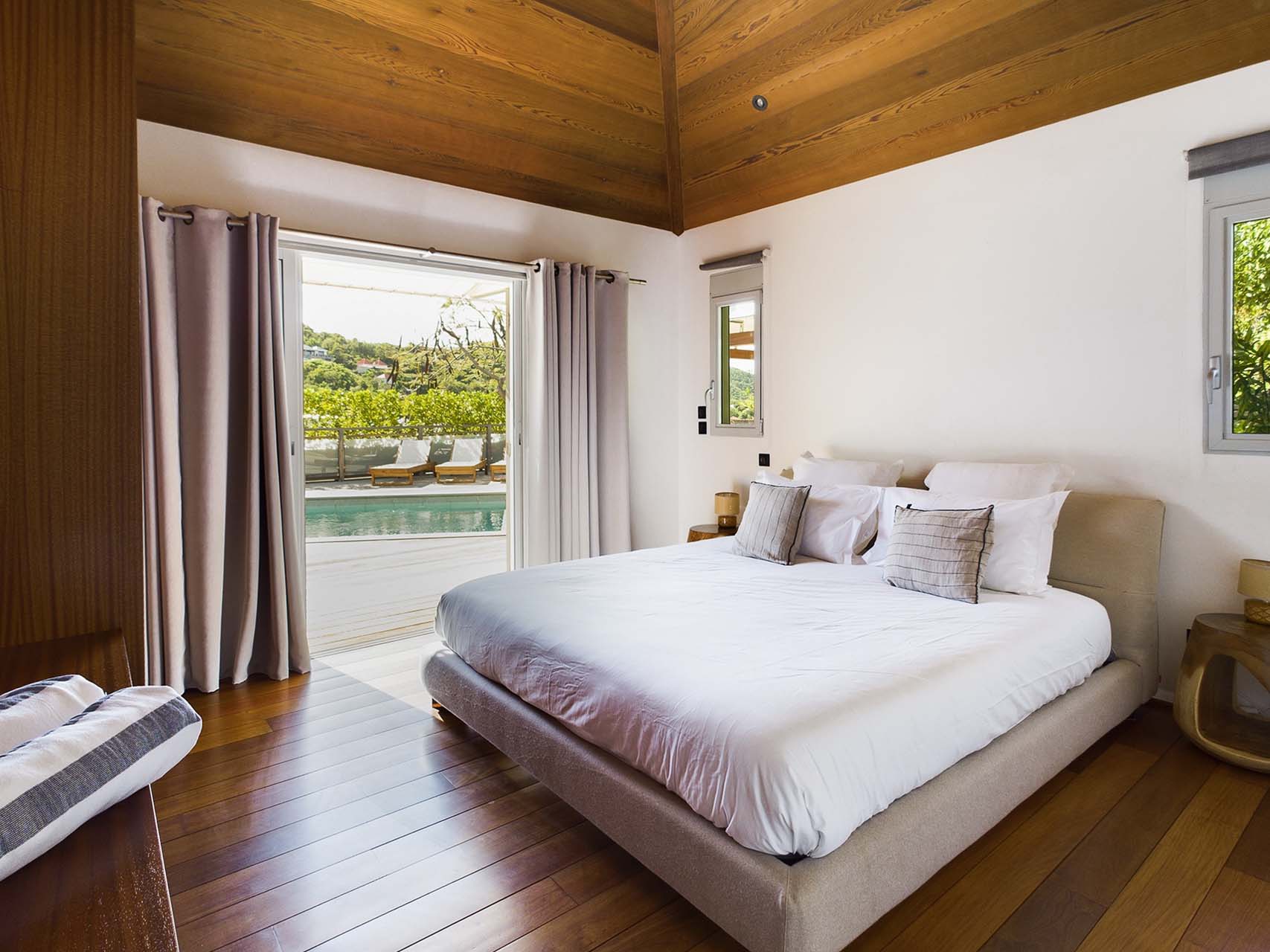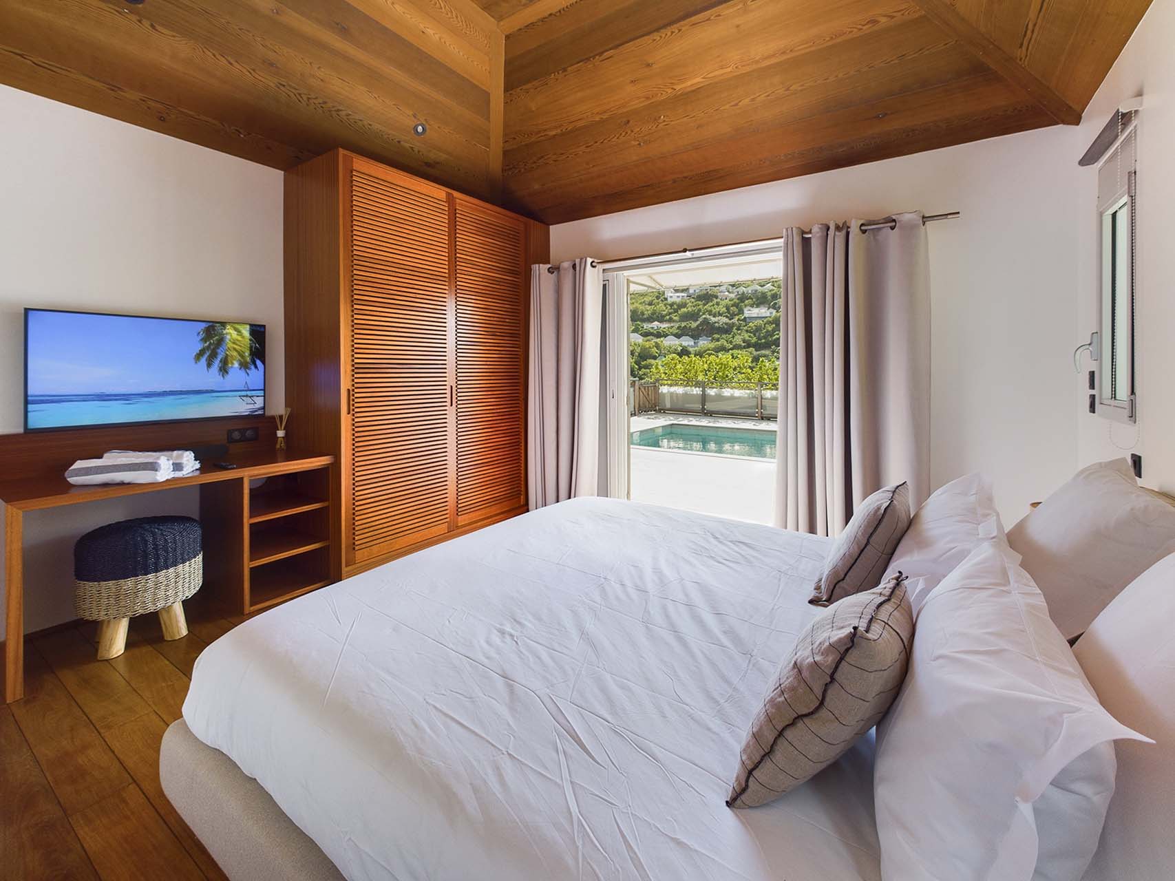 La chambre principale avec sa salle de bain attenante se trouve sur la gauche du salon. Sur le côté droit, deux autres chambres de confort équivalent font face à la piscine , l’une d’elles peut être aménagée en lits jumeaux, idéale pour des enfants ou des adolescents. Ces deux chambres partagent une salle de bain, également accessible depuis la terrasse.