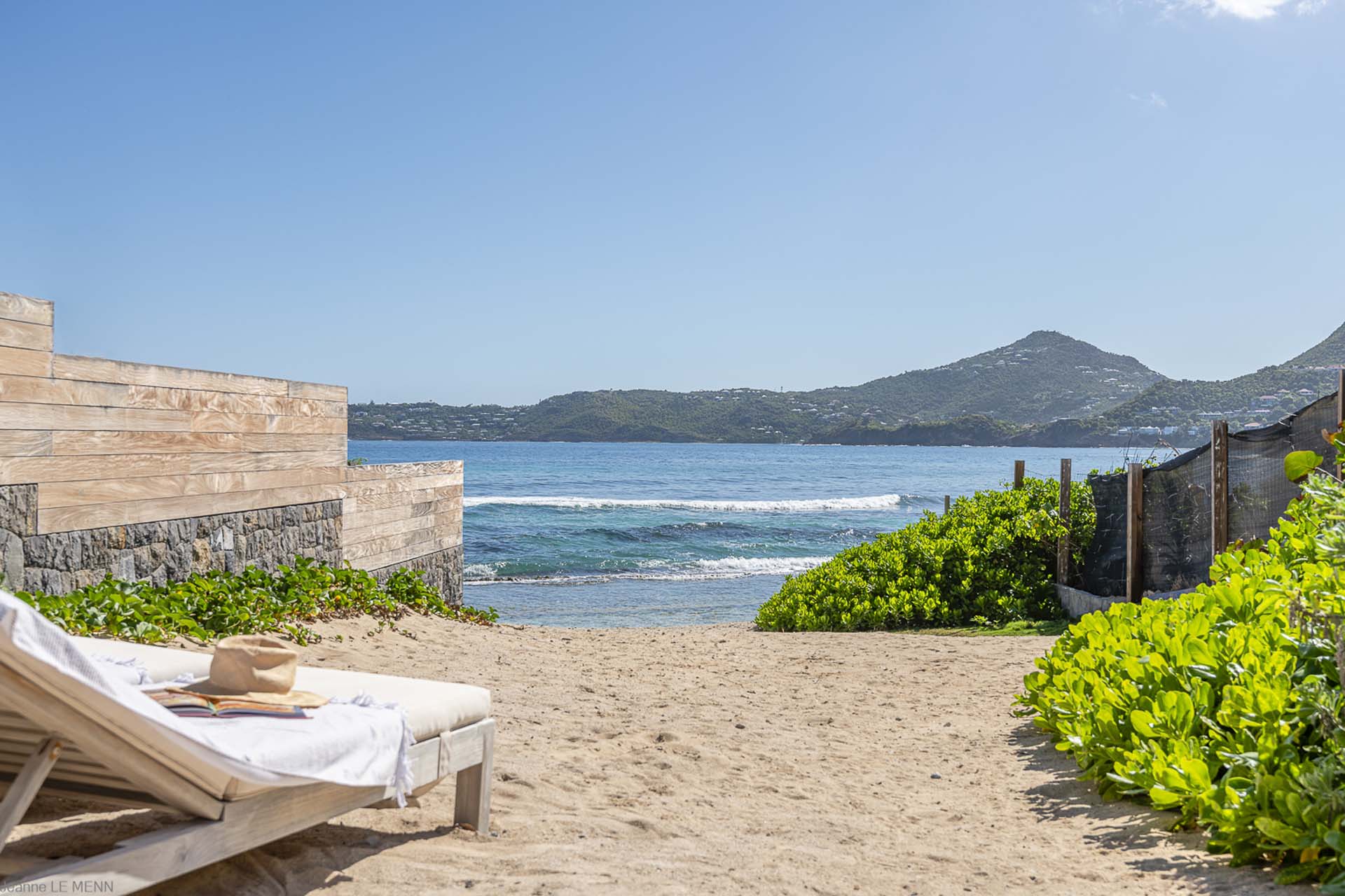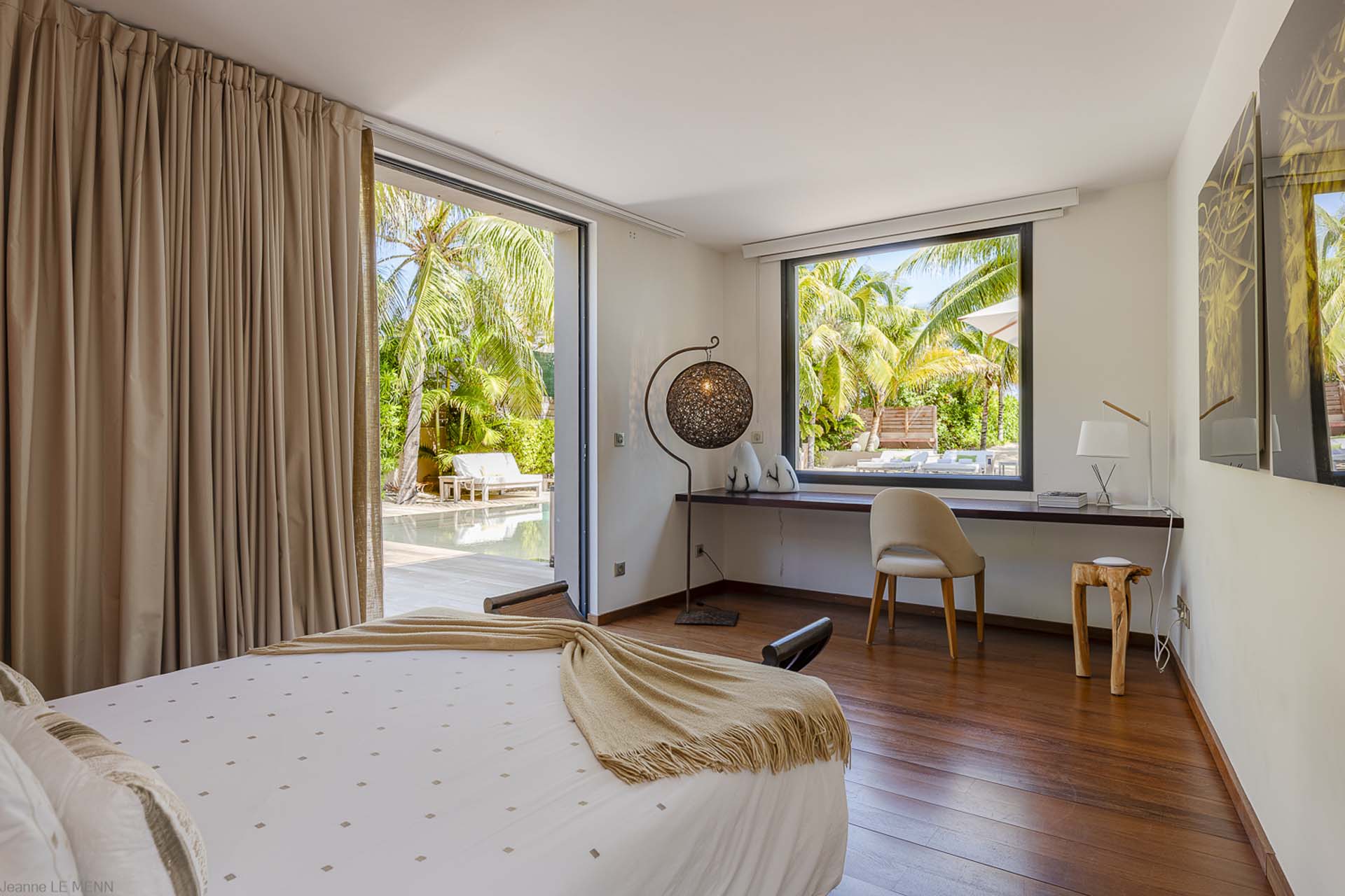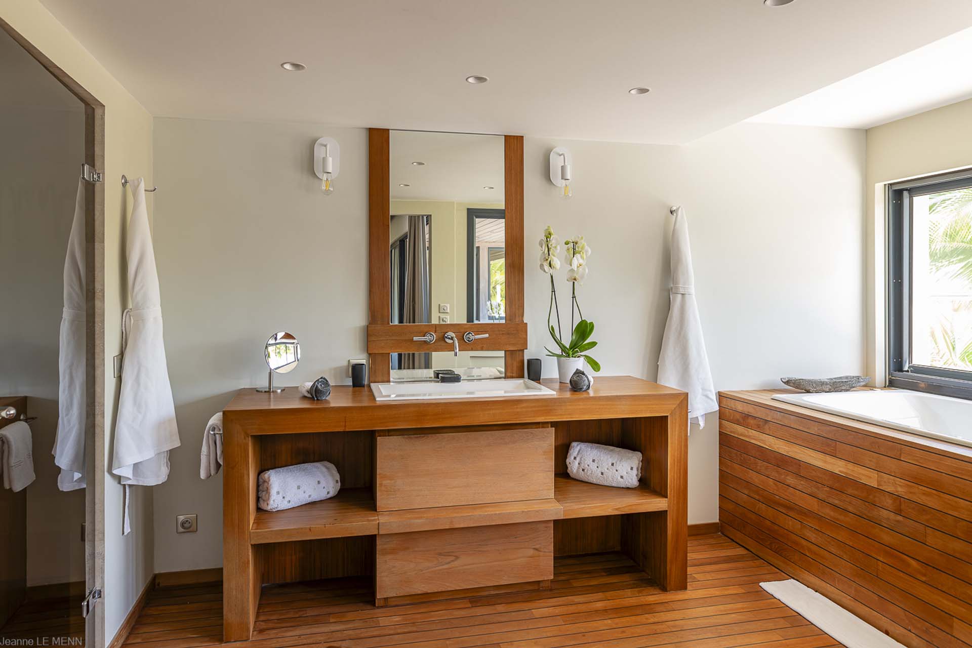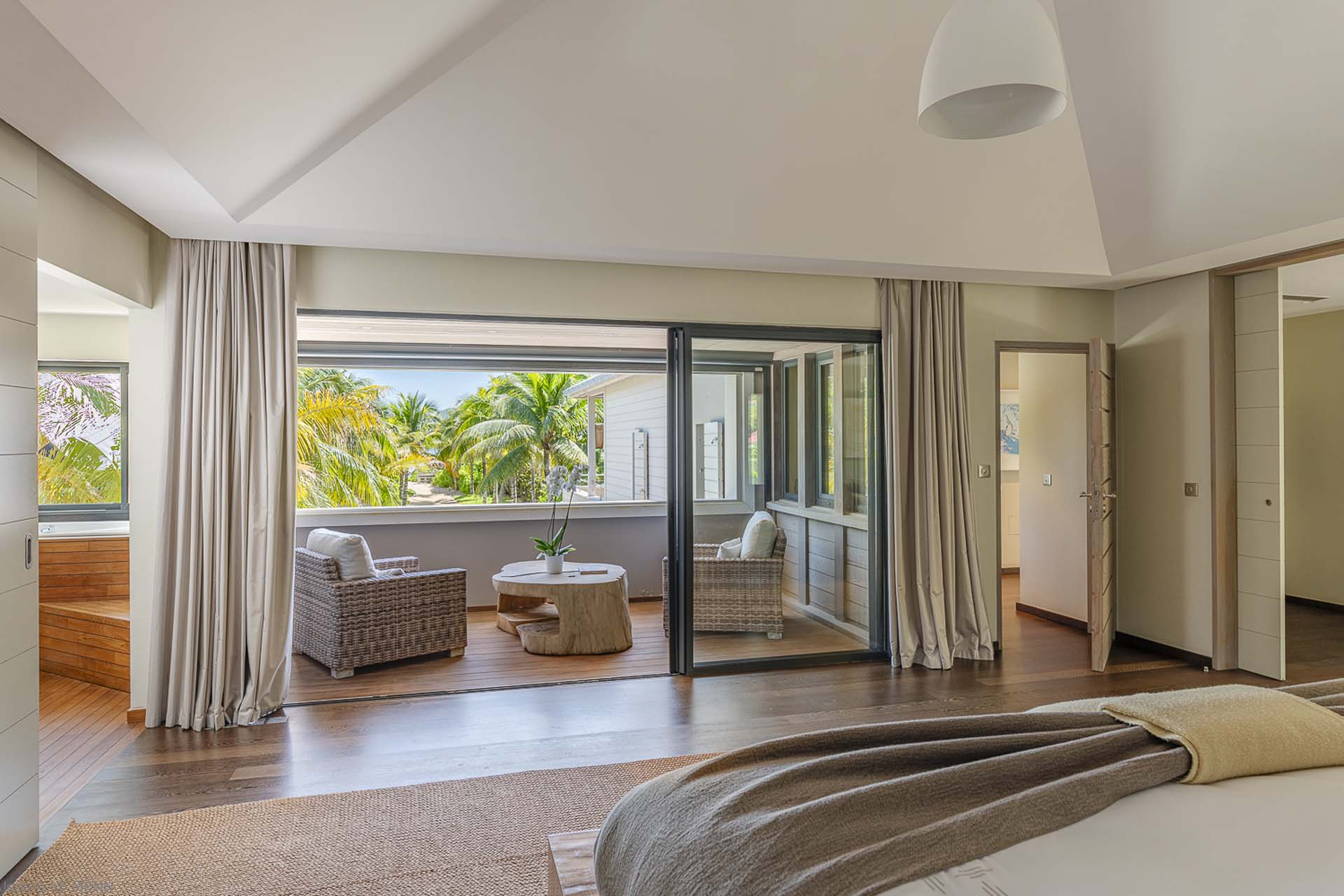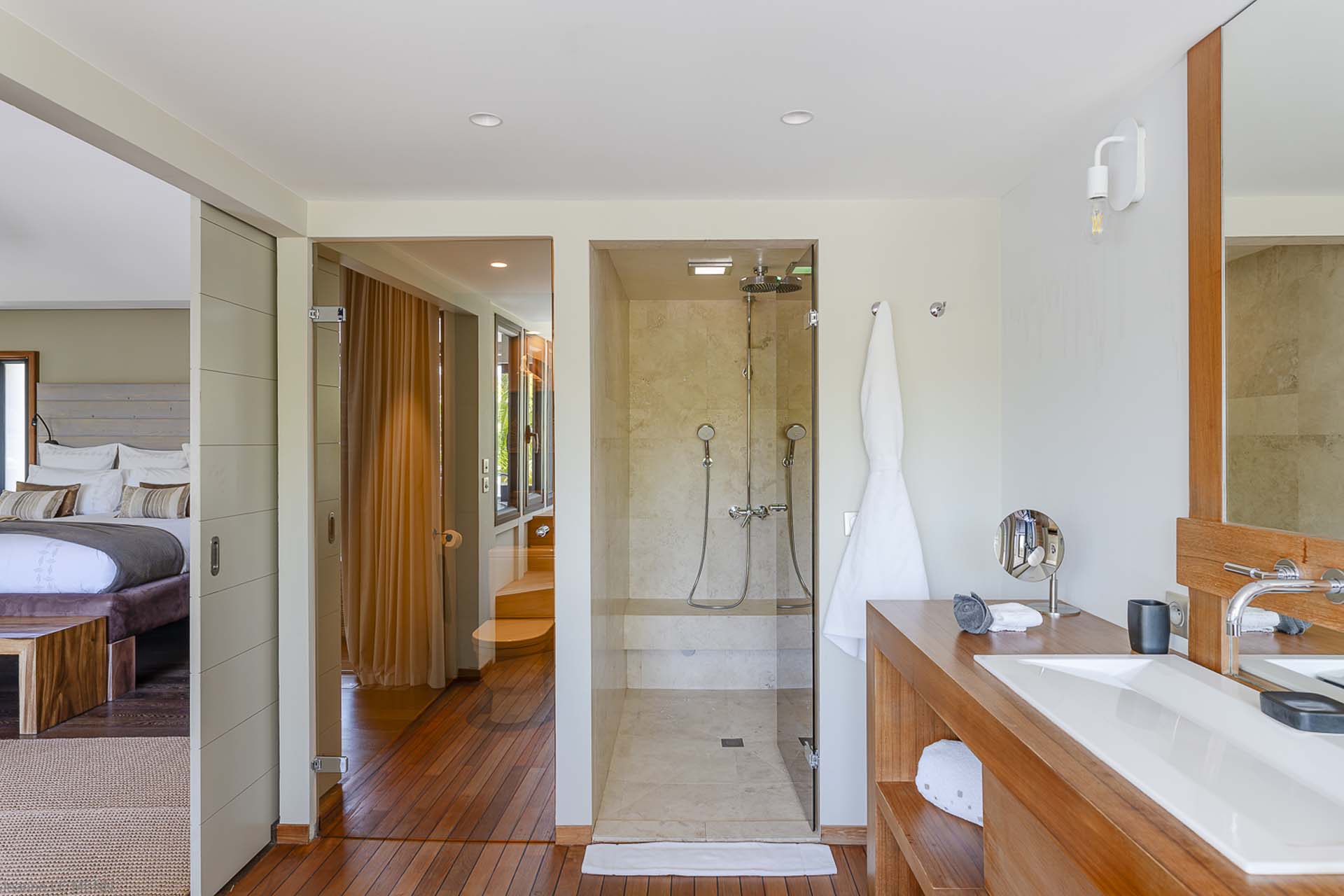 Son heureux propriétaire s’est donc fait plaisir et a concentré dans cette villa moderne toute neuve, tous ses désirs. De grands decks en bois exotiques finissent au pied d’un sentier en sable conduisant au bord de la mer. Une grande piscine chauffée entourée de palmiers, est orientée dans l’axe de la vue. Les grandes baies vitrées du salon climatisé, s’ouvrent sur un immense deck aménagé avec des transats… La chambre principale comprend un hammam, une salle de bain avec une baignoire surplombant le deck et la piscine, et un salon privé avec un écran plat. Enfin, toutes les chambres ont soit une vue sur la mer, soit une vue sur la piscine et le deck.
