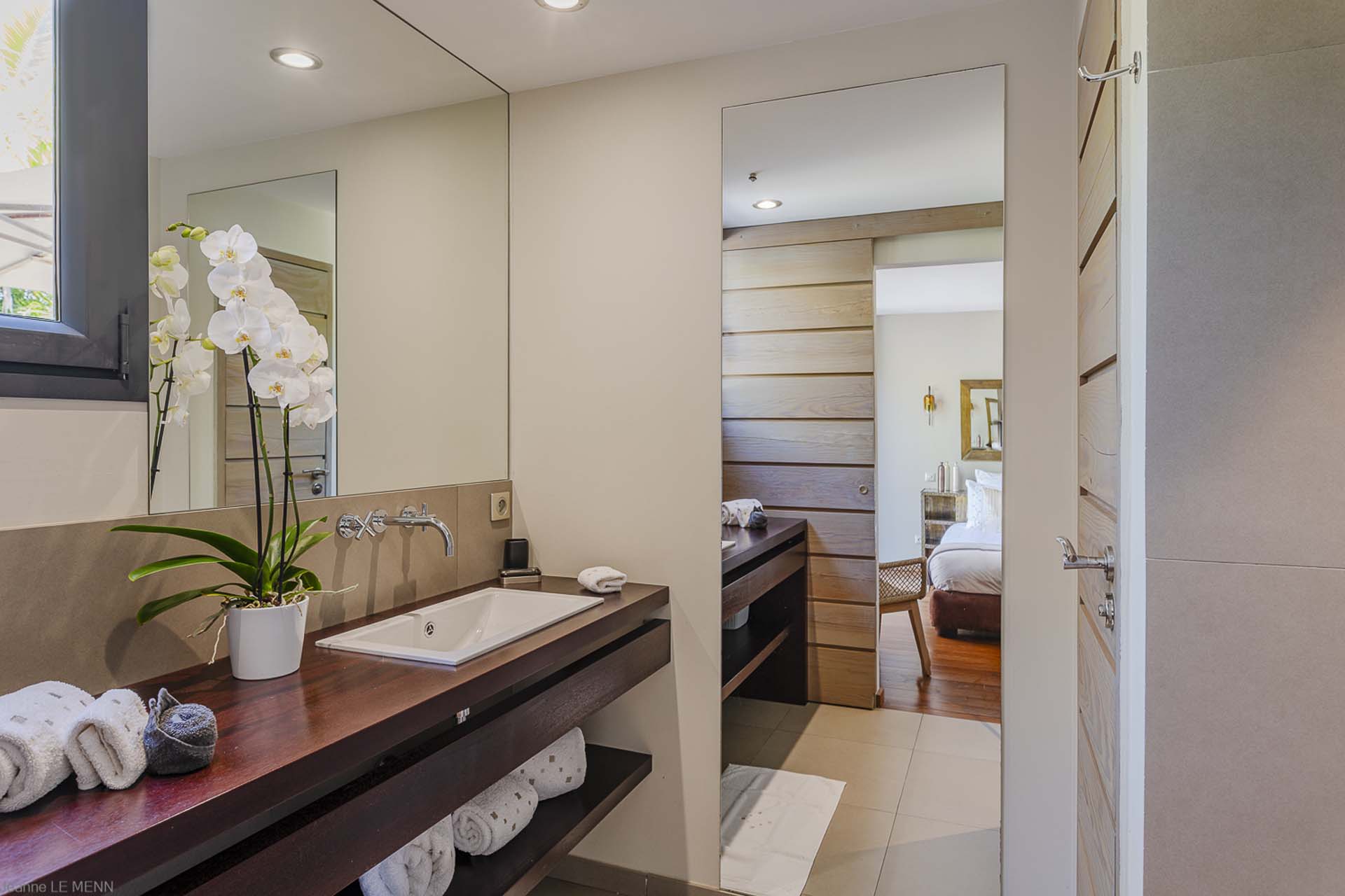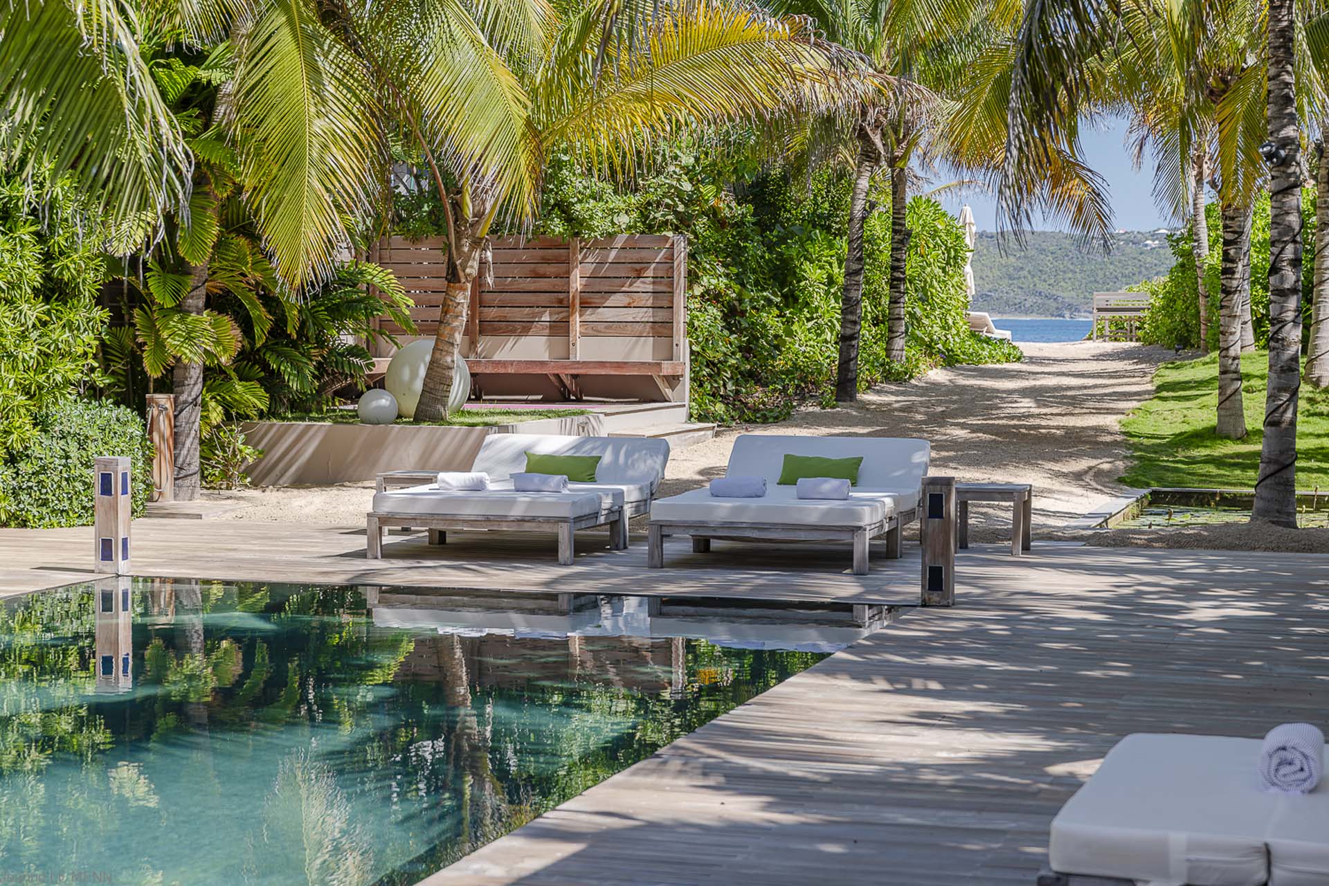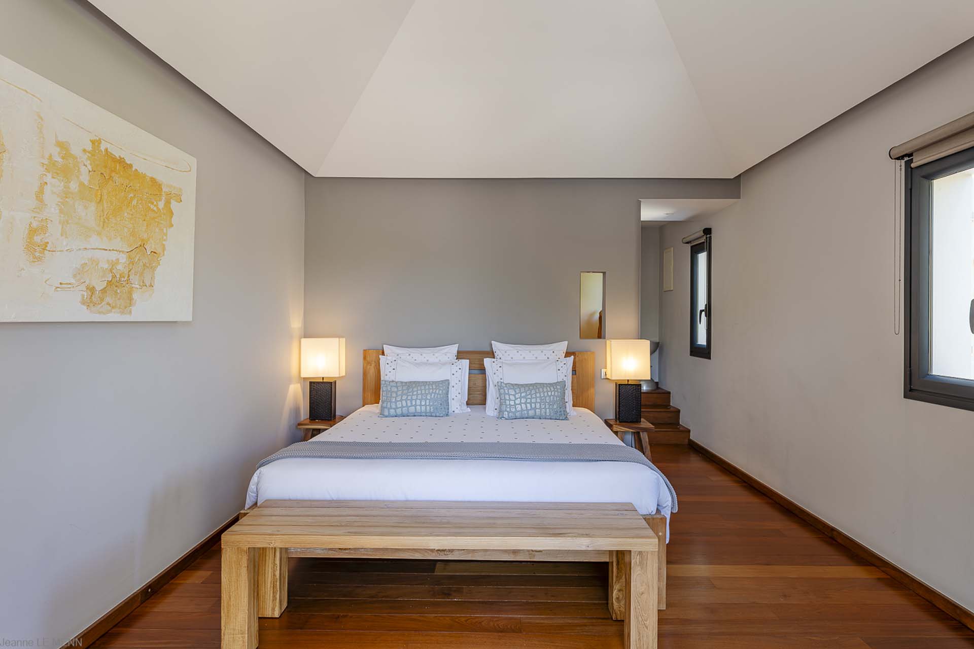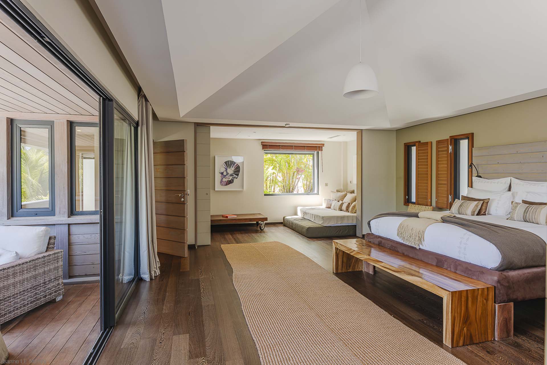 Son heureux propriétaire s’est donc fait plaisir et a concentré dans cette villa moderne toute neuve, tous ses désirs. De grands decks en bois exotiques finissent au pied d’un sentier en sable conduisant au bord de la mer. Une grande piscine chauffée entourée de palmiers, est orientée dans l’axe de la vue. Les grandes baies vitrées du salon climatisé, s’ouvrent sur un immense deck aménagé avec des transats… La chambre principale comprend un hammam, une salle de bain avec une baignoire surplombant le deck et la piscine, et un salon privé avec un écran plat. Enfin, toutes les chambres ont soit une vue sur la mer, soit une vue sur la piscine et le deck.