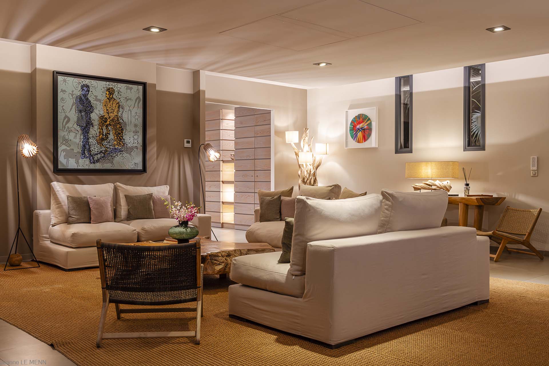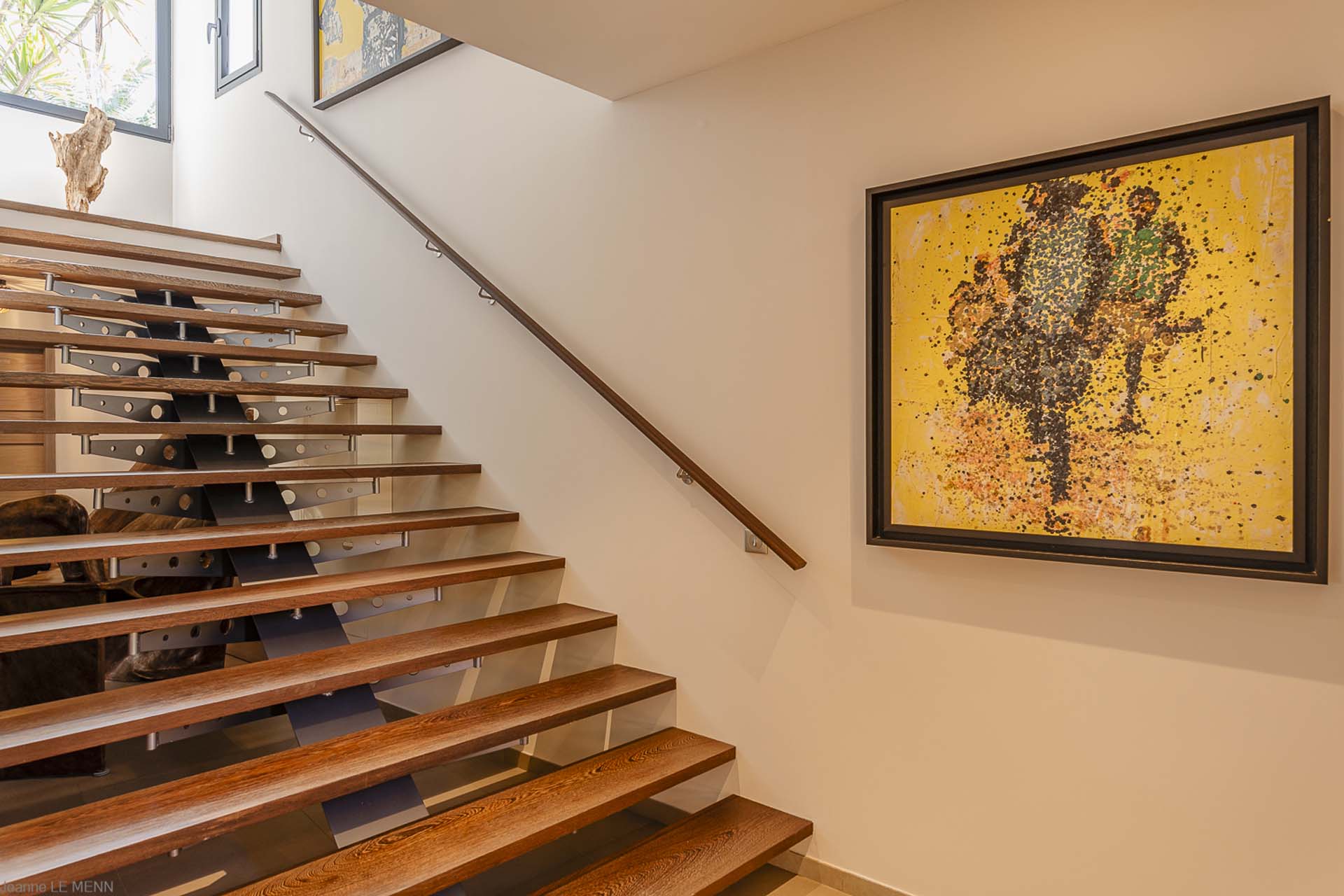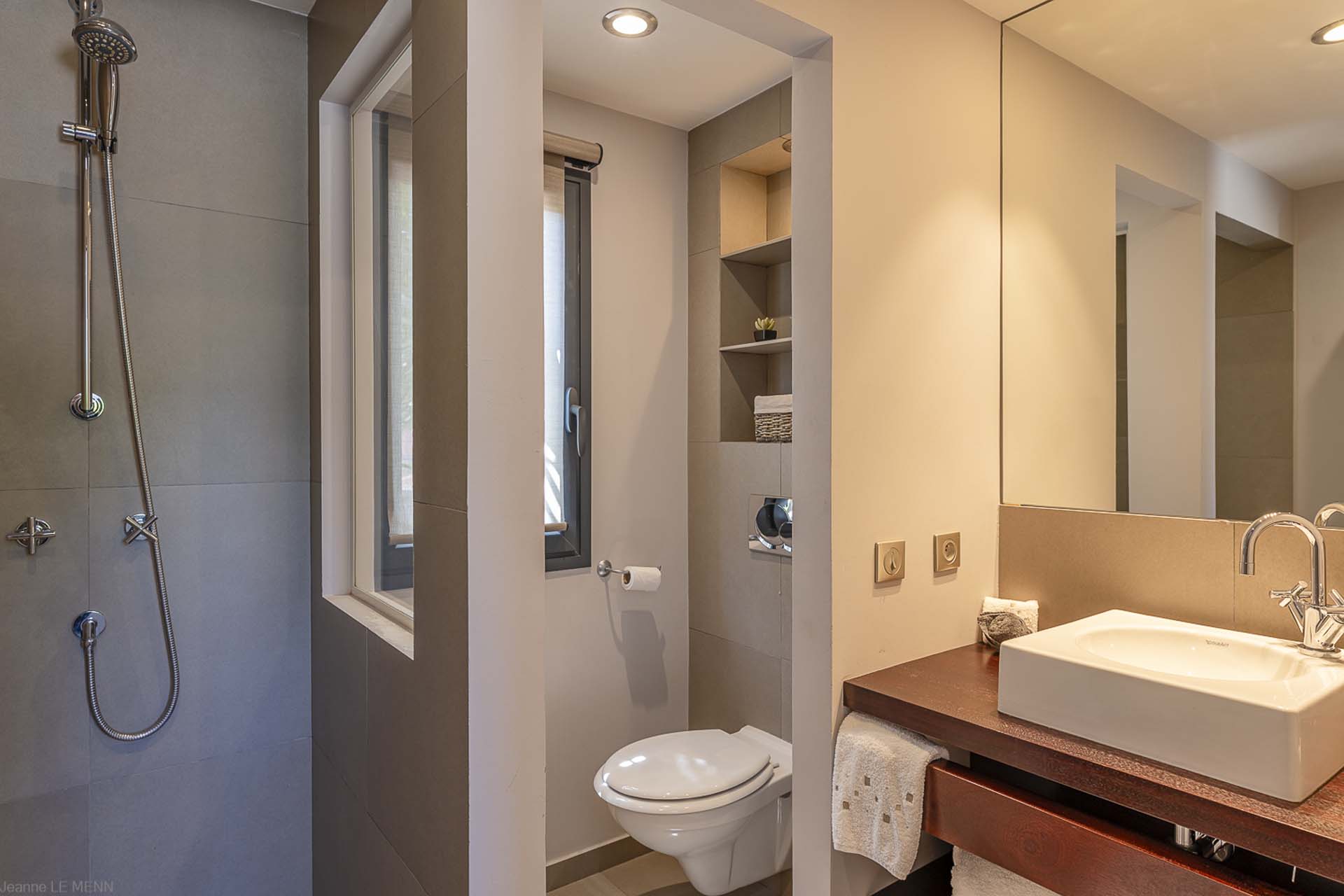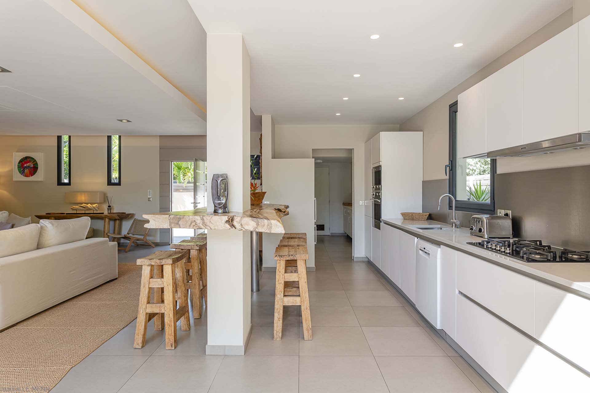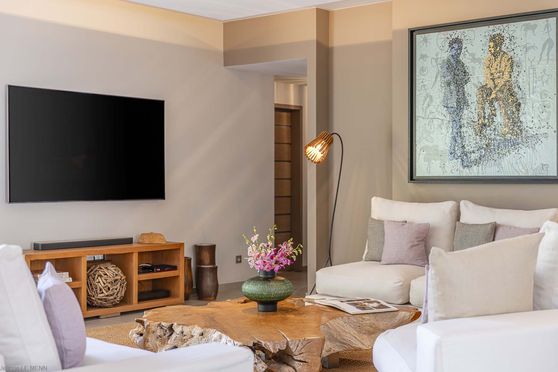 Son heureux propriétaire s’est donc fait plaisir et a concentré dans cette villa moderne toute neuve, tous ses désirs. De grands decks en bois exotiques finissent au pied d’un sentier en sable conduisant au bord de la mer. Une grande piscine chauffée entourée de palmiers, est orientée dans l’axe de la vue. Les grandes baies vitrées du salon climatisé, s’ouvrent sur un immense deck aménagé avec des transats… La chambre principale comprend un hammam, une salle de bain avec une baignoire surplombant le deck et la piscine, et un salon privé avec un écran plat. Enfin, toutes les chambres ont soit une vue sur la mer, soit une vue sur la piscine et le deck.