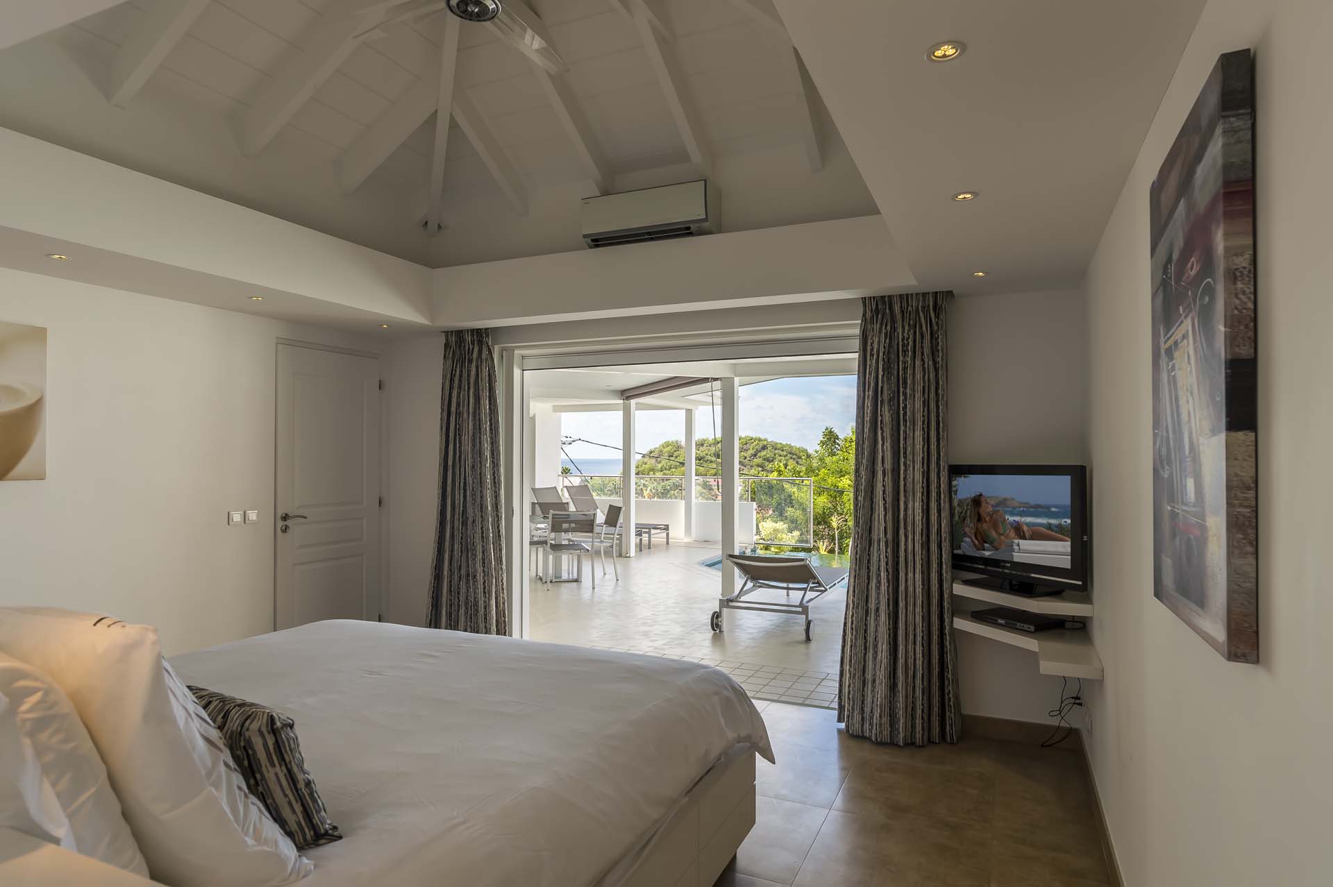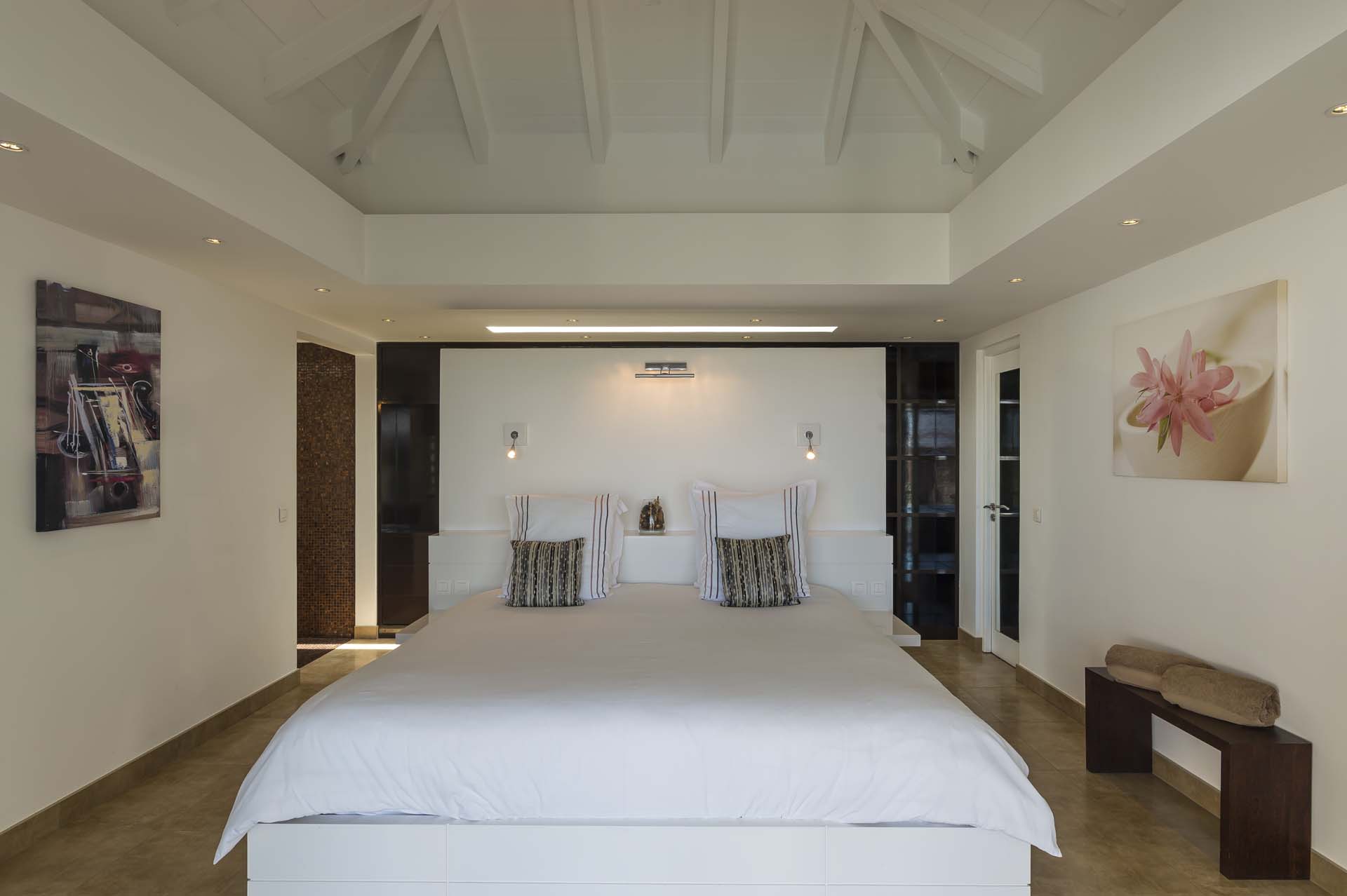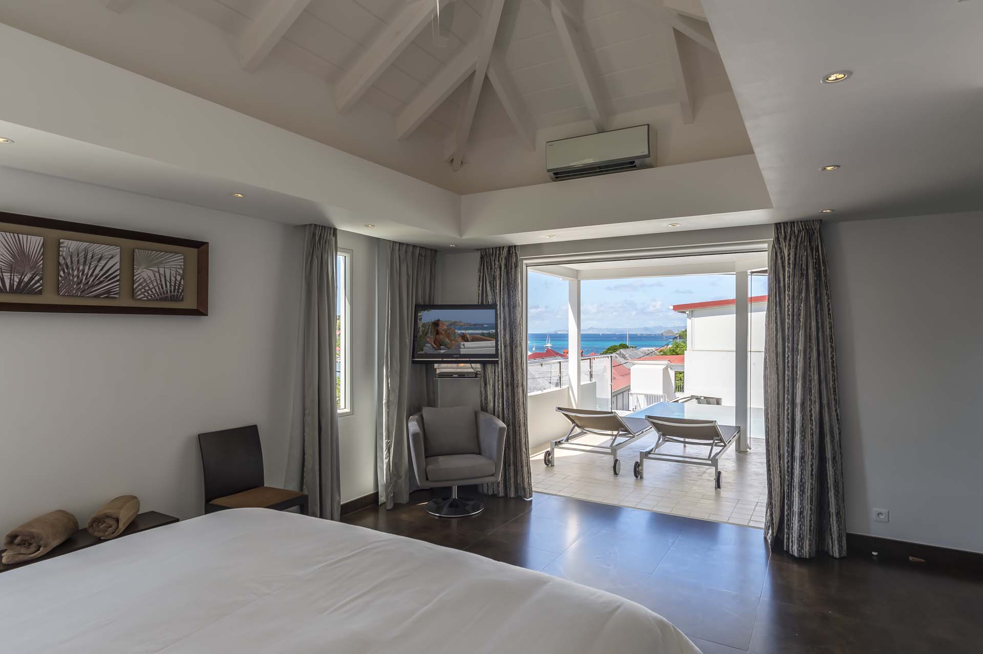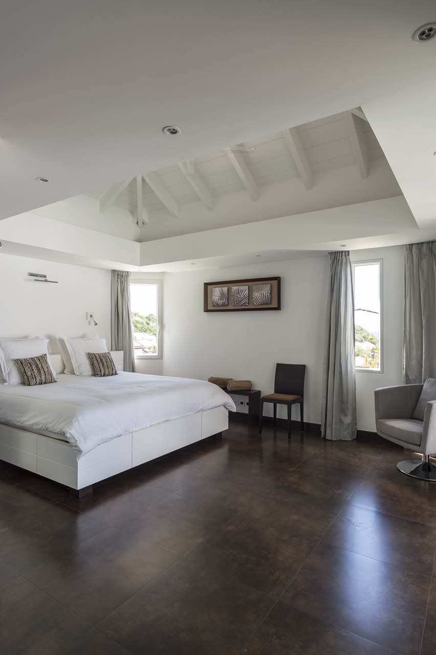 Les deux chambres, de taille égale et de chaque côté du salon, s’ouvrent toutes deux sur le port de Gustavia.