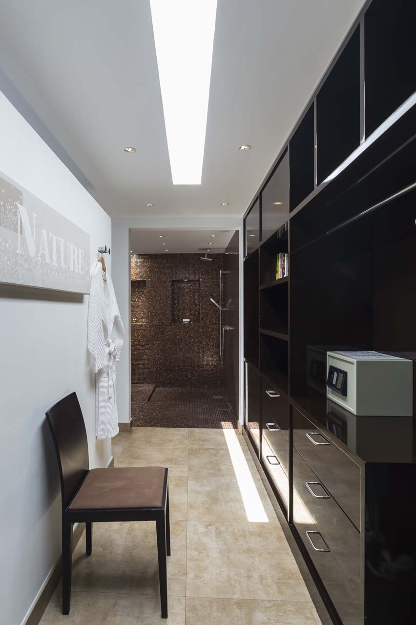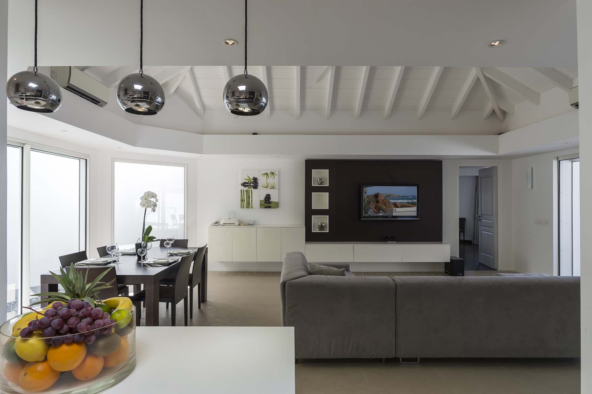 La décoration est très contemporaine, et pour plus de confort, le salon climatisé.