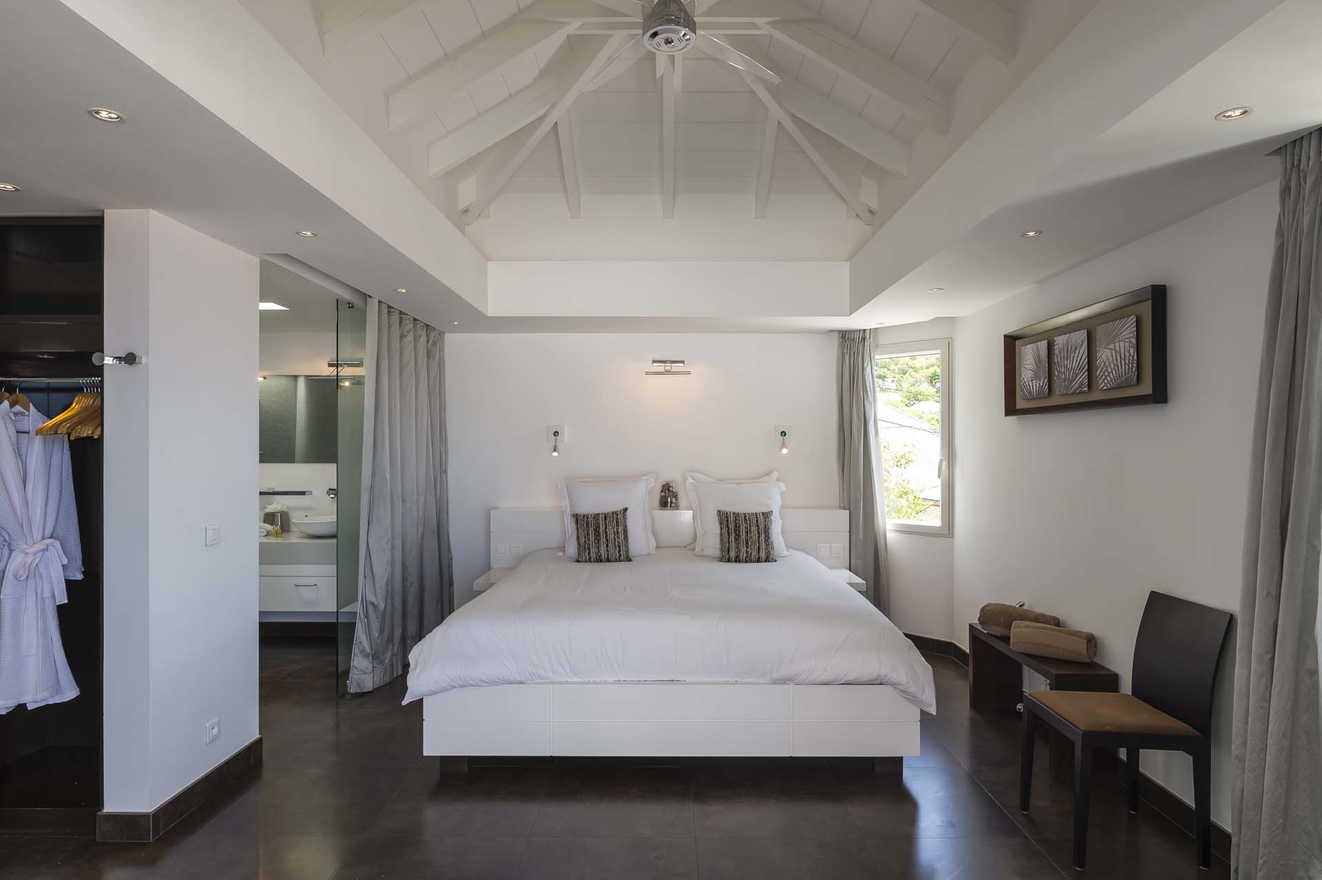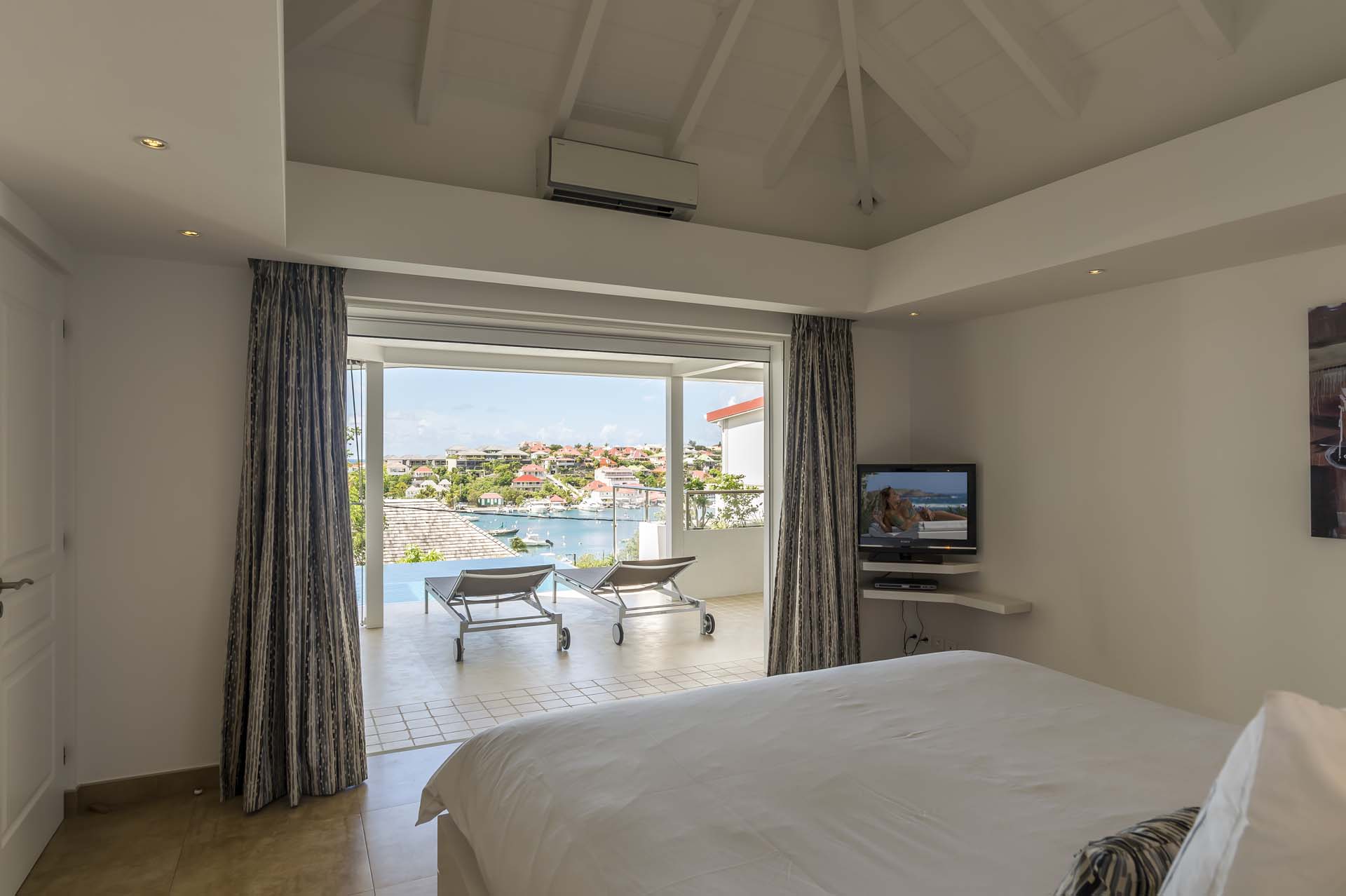 Les deux chambres, de taille égale et de chaque côté du salon, s’ouvrent toutes deux sur le port de Gustavia.