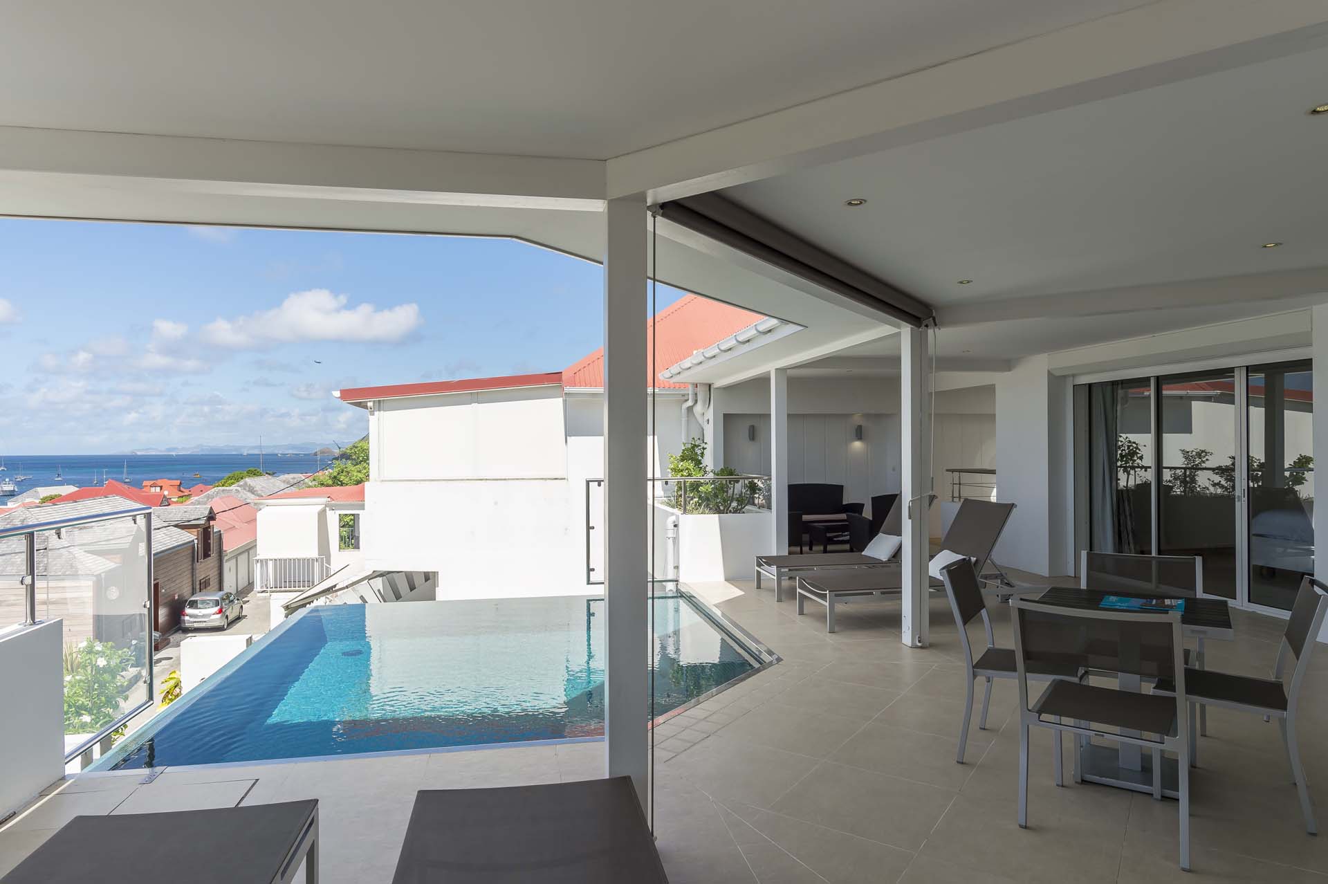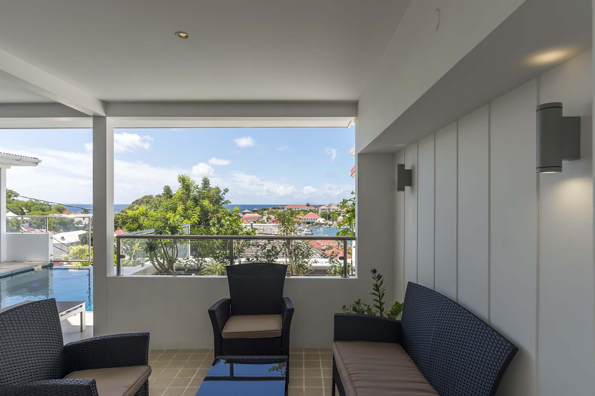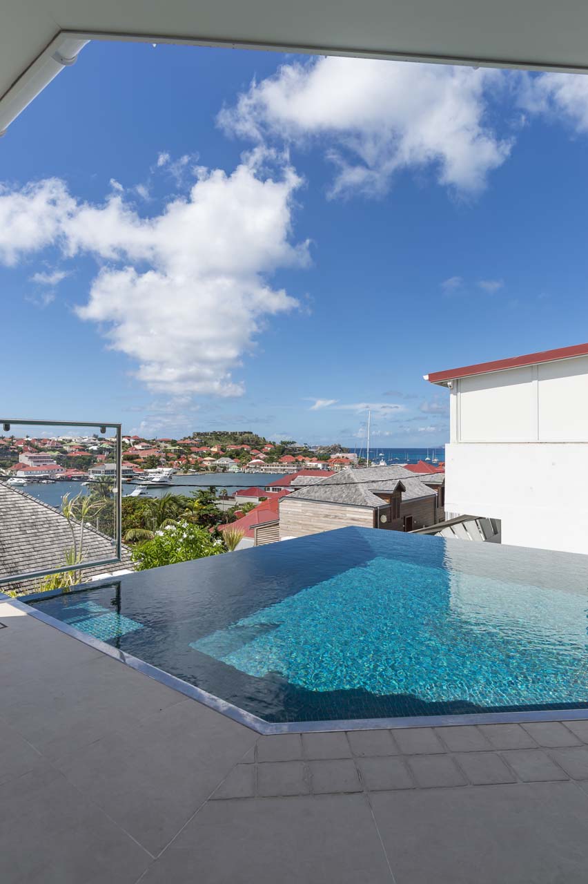 Située sur les hauteurs de Gustavia à *Saint Barthelemy*, elle domine littéralement le port. L’hôtel le plus proche est l’Emeraude Plage. A seulement quelques mètres à pied des restaurants, boutiques, de la plage de Shell Beach et vie nocturne, cette villa est idéale pour ceux qui désirent être au centre des activités.