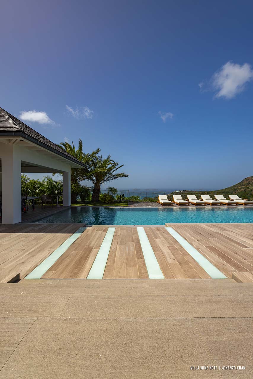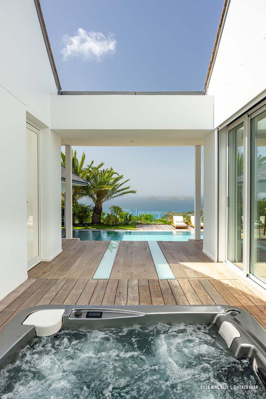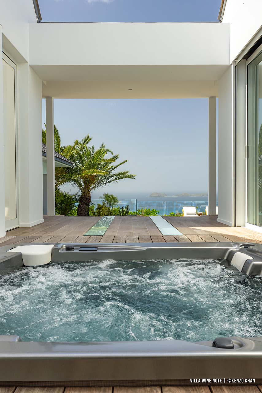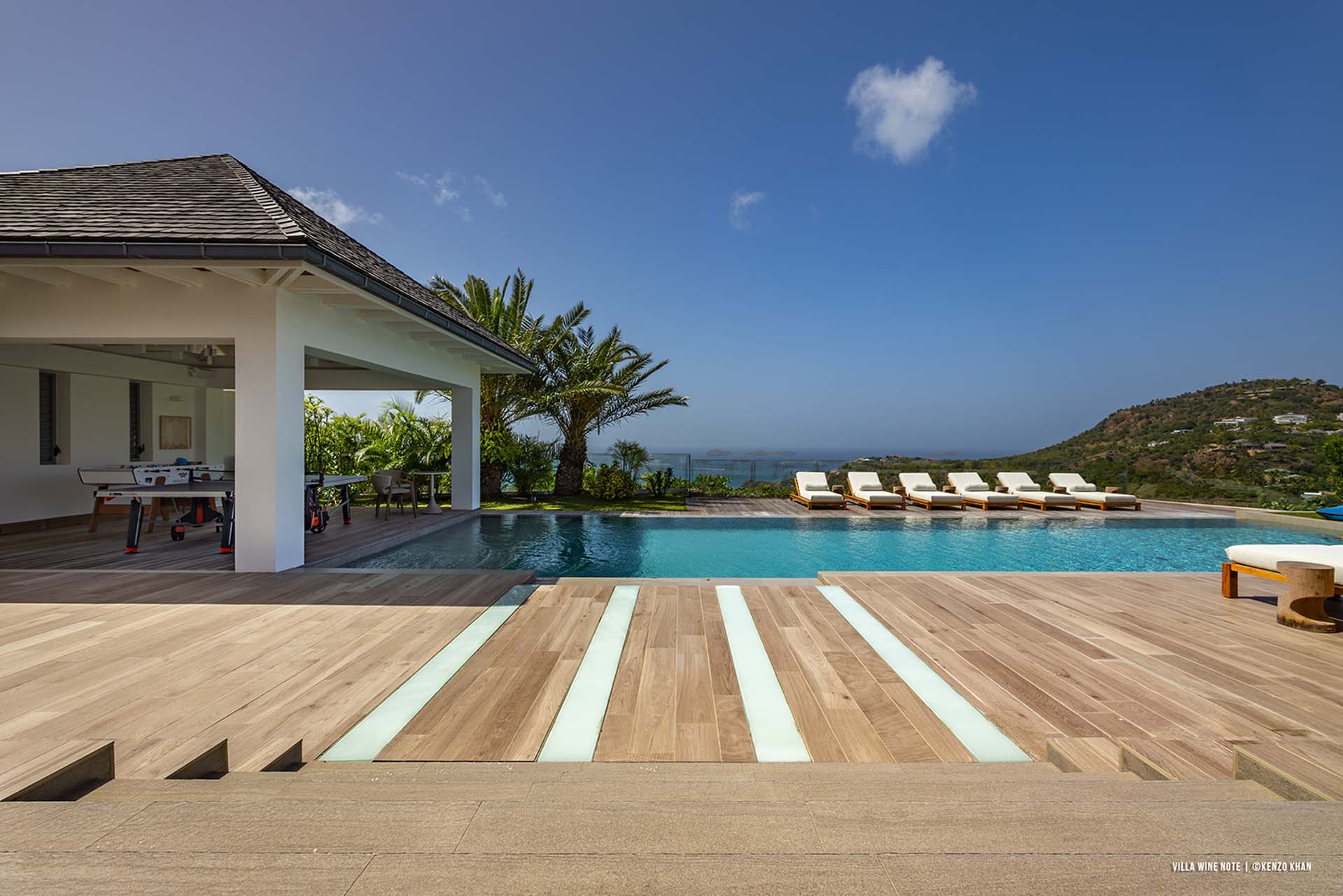 La villa est dotée d’une très grande piscine chauffée et d’une vue magnifique sur la baie de Saint Jean d’une part et sur Salines d’autre part. L’architecture moderne et les installations perfectionnées de la villa vous offrent tout le confort nécessaire pour un séjour en famille ou entre amis. Vous profiterez d’un espace extérieur parfaitement équipé, avec deux terrasses couvertes ainsi que d’une magnifique cascade d’eau partant du bungalow situé sur l’arrière de la villa et rejoignant la piscine. La villa, ayant pour thème le vin, possède également deux caves à vins pour les amateurs.