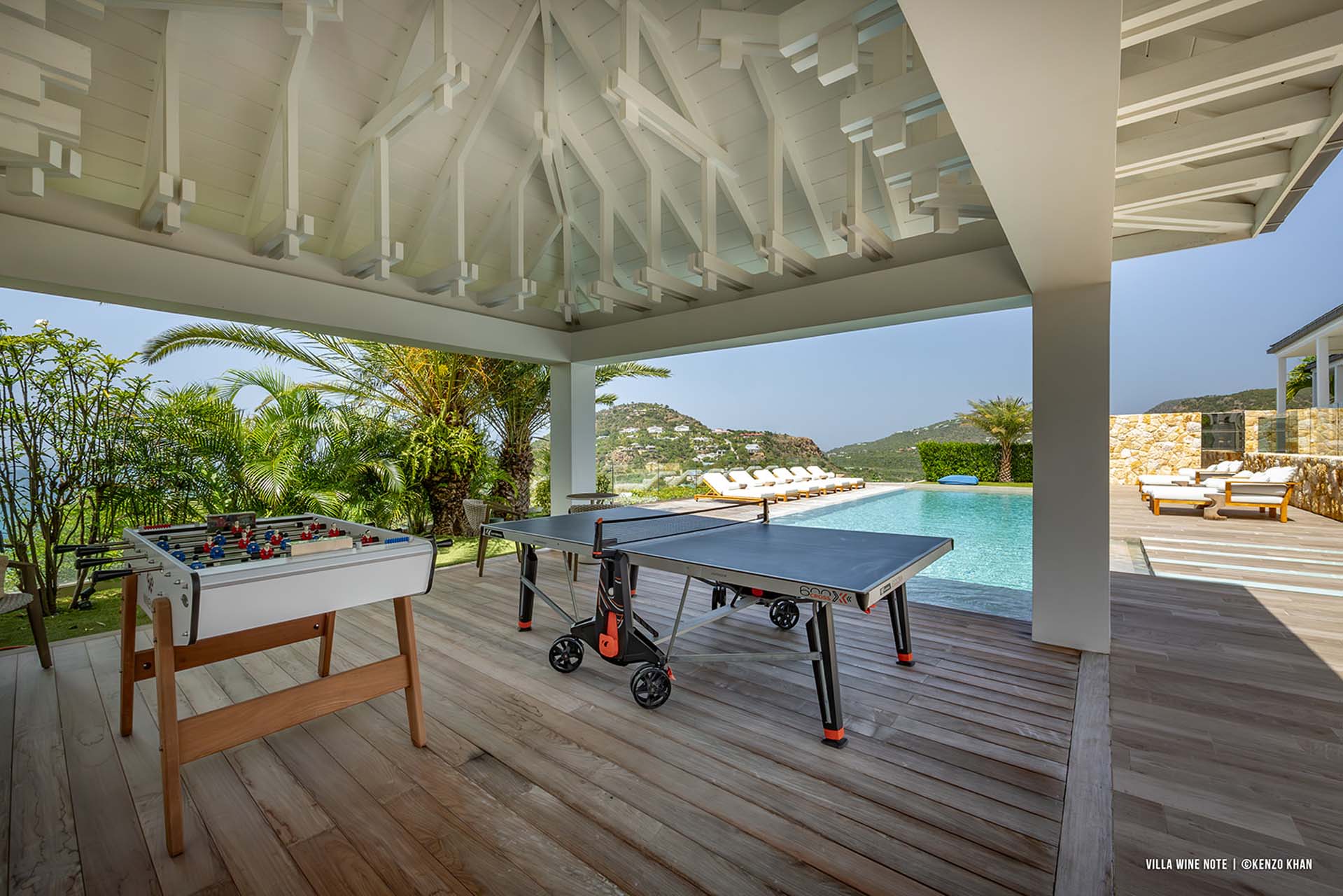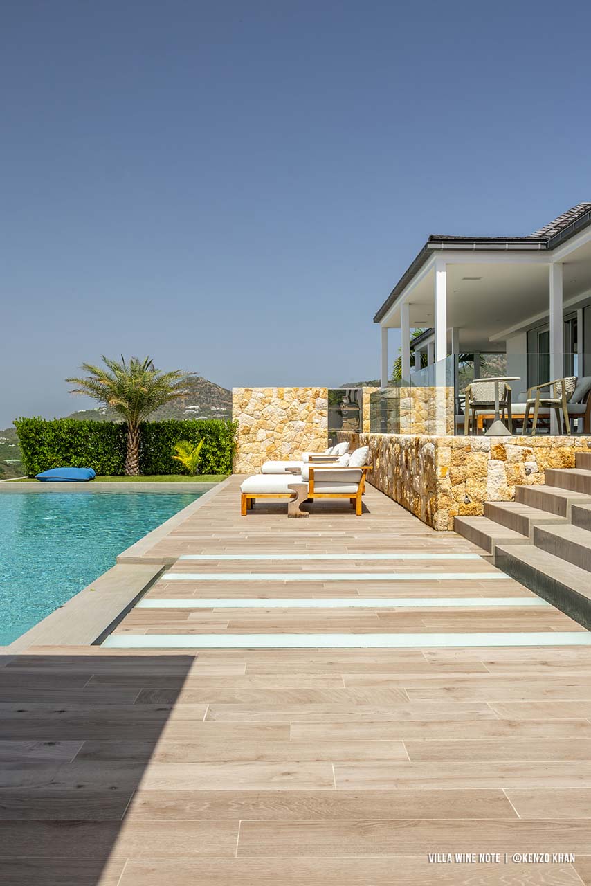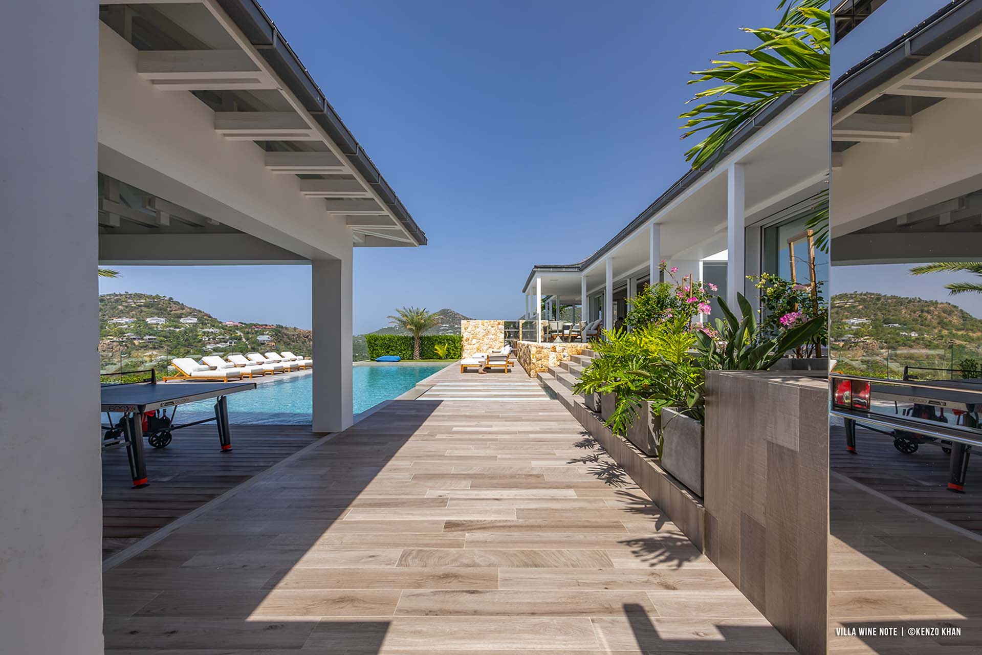 La villa est dotée d’une très grande piscine chauffée et d’une vue magnifique sur la baie de Saint Jean d’une part et sur Salines d’autre part. L’architecture moderne et les installations perfectionnées de la villa vous offrent tout le confort nécessaire pour un séjour en famille ou entre amis. Vous profiterez d’un espace extérieur parfaitement équipé, avec deux terrasses couvertes ainsi que d’une magnifique cascade d’eau partant du bungalow situé sur l’arrière de la villa et rejoignant la piscine. La villa, ayant pour thème le vin, possède également deux caves à vins pour les amateurs.