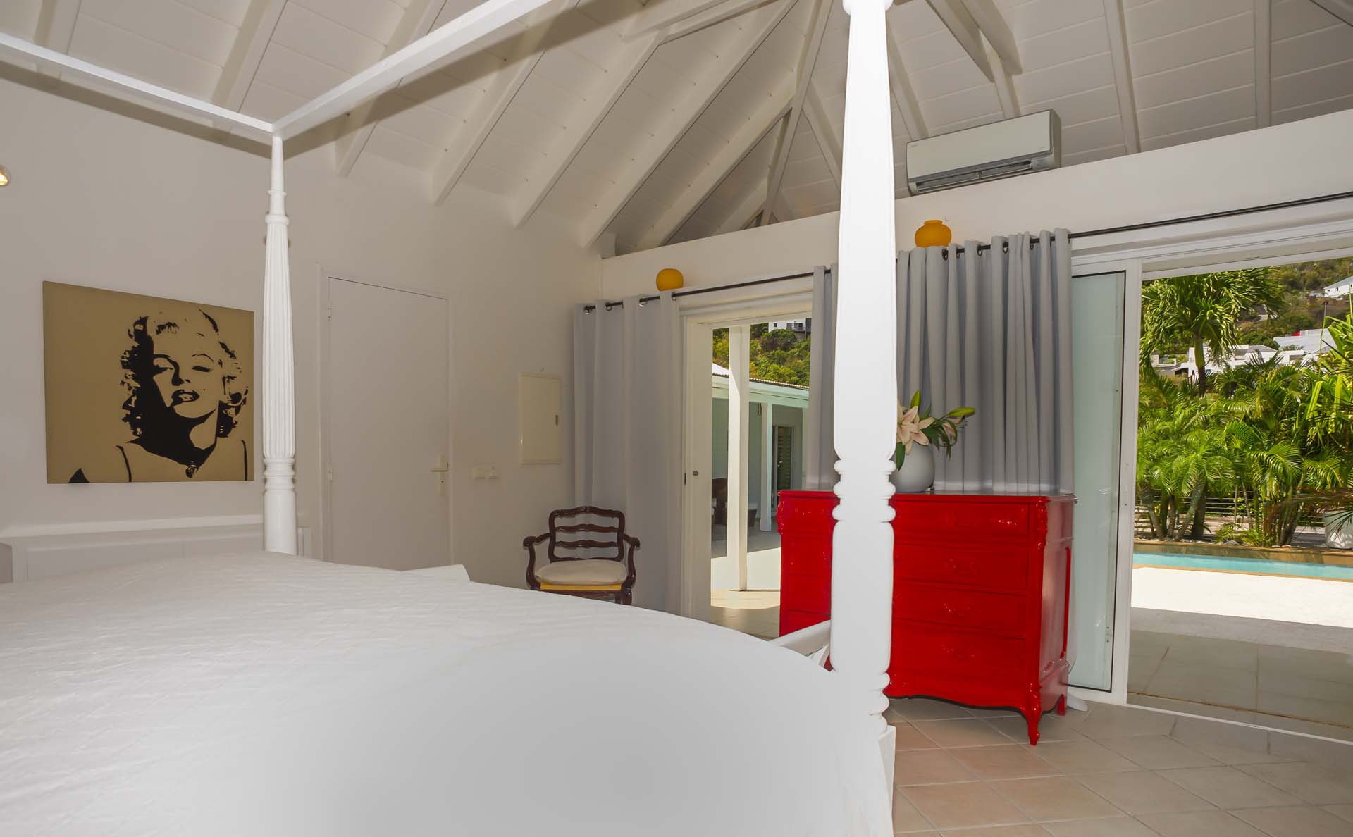 La villa de plain-pied est ouverte sur une grande terrasse et une piscine donnant sur la baie de Flamands.