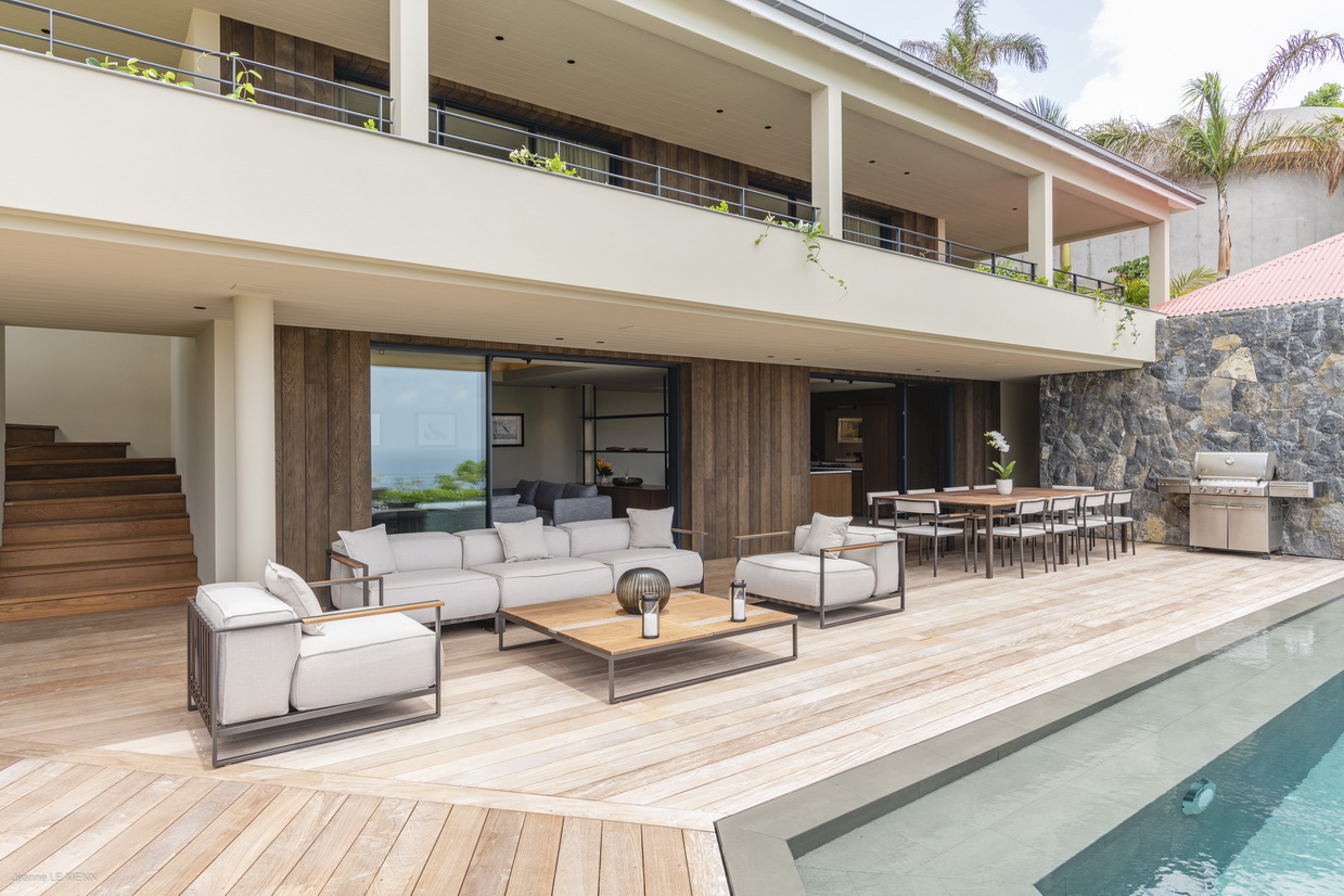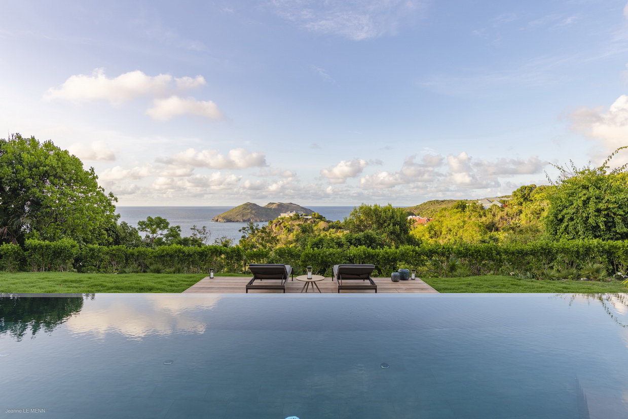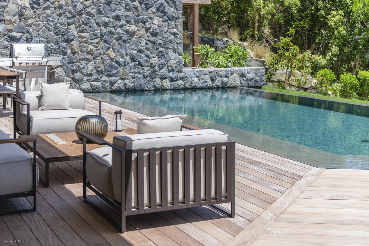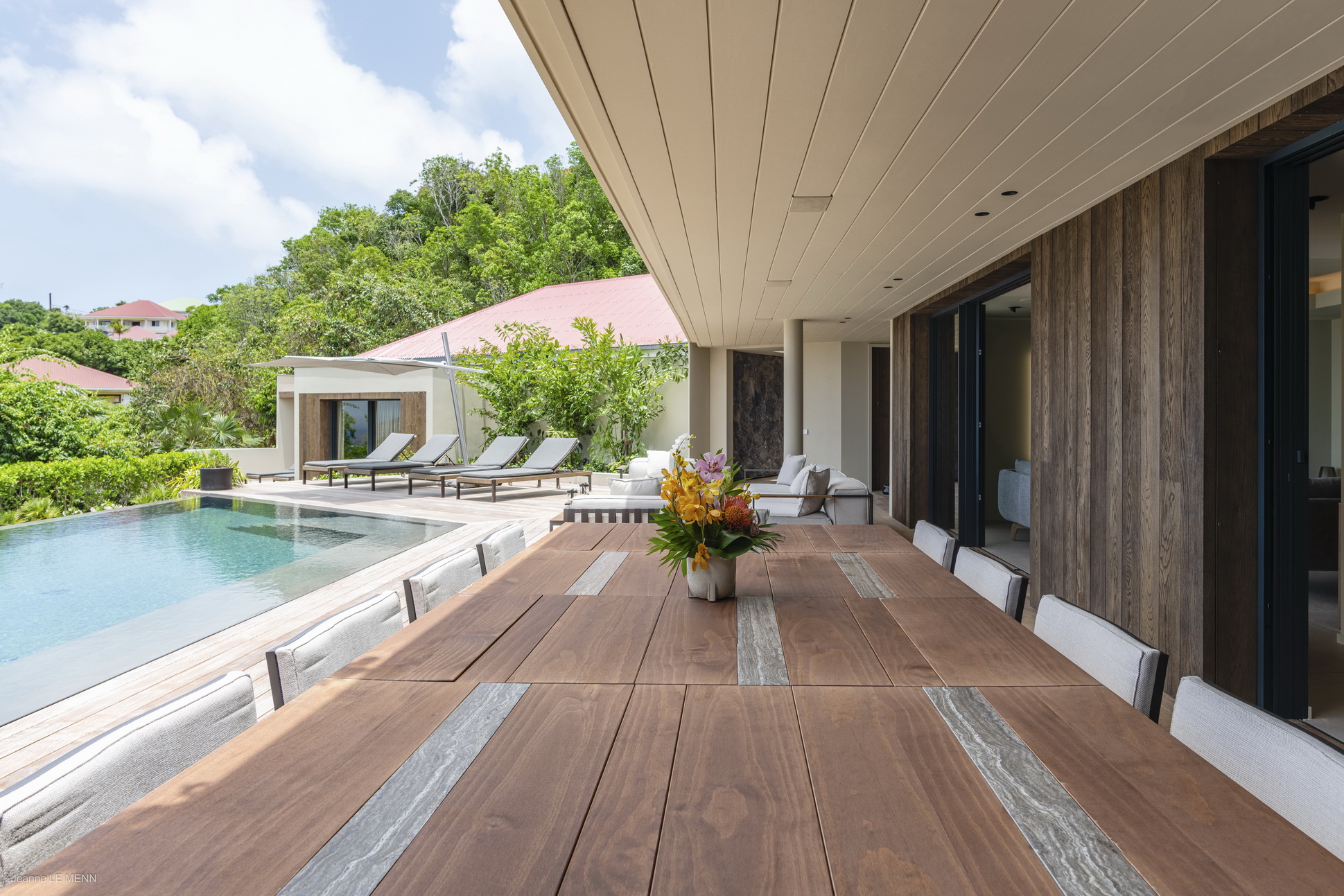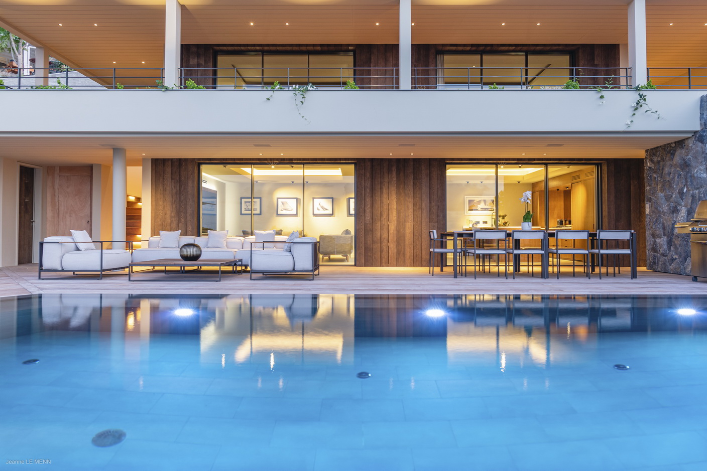 La terrasse est composée d’une piscine chauffée à débordement, d’un salon et d’une salle à manger extérieure pouvant accueillir jusqu’à 10 convives.