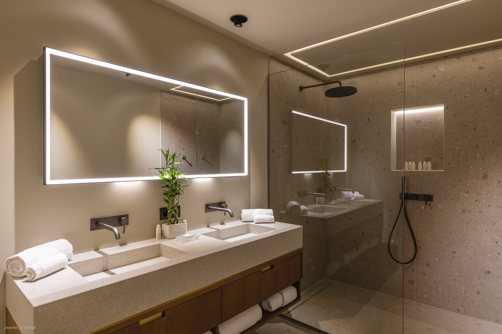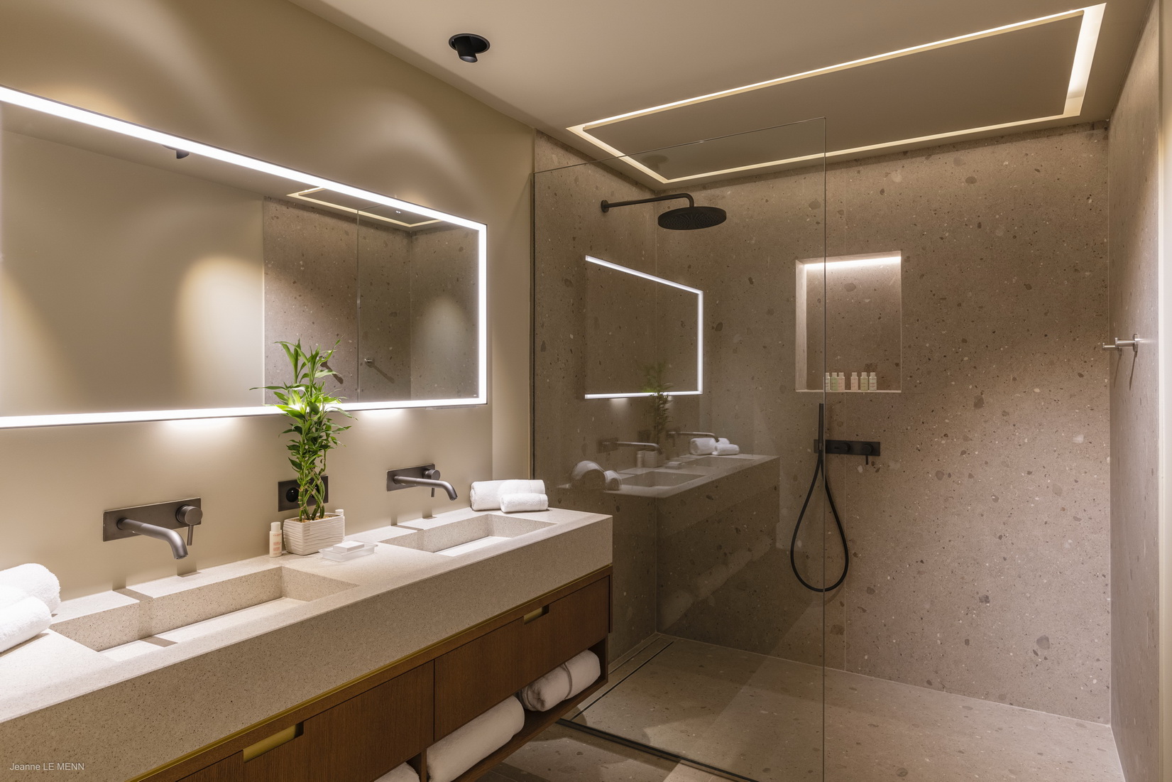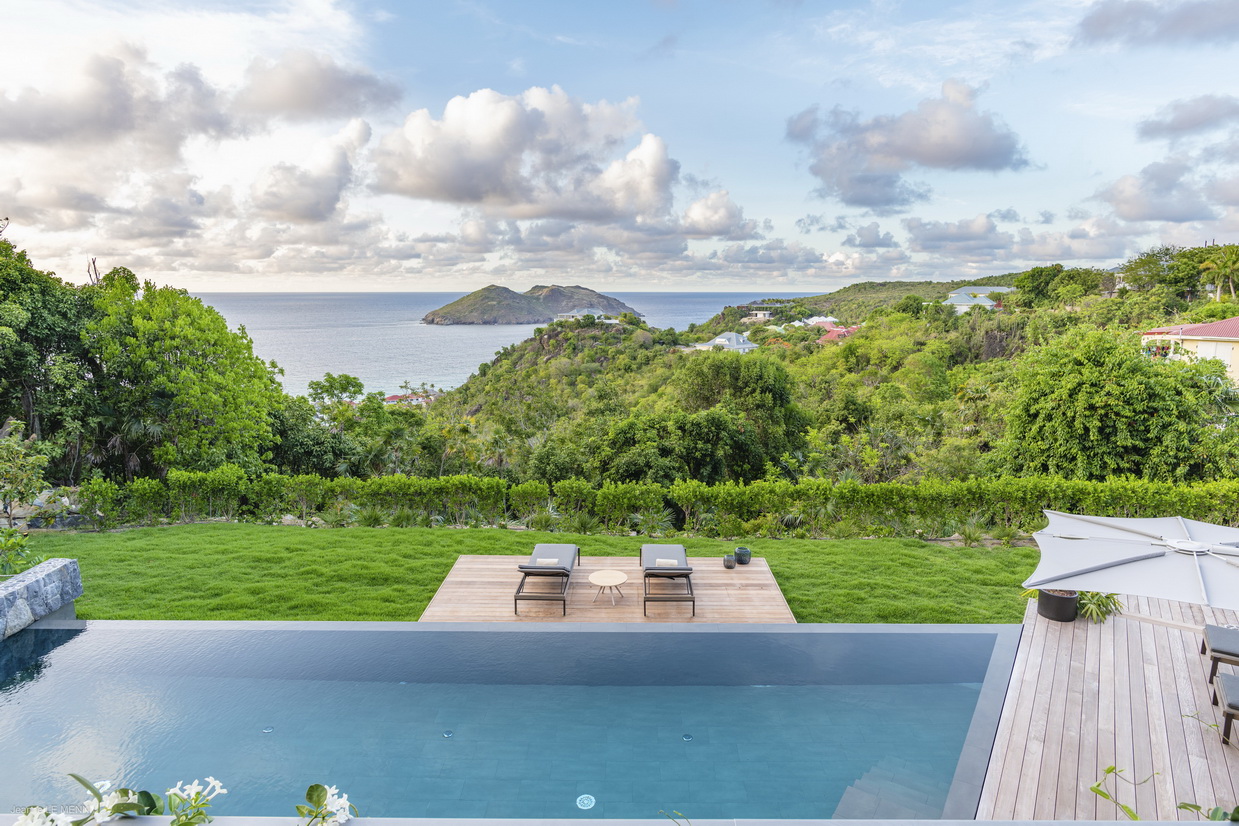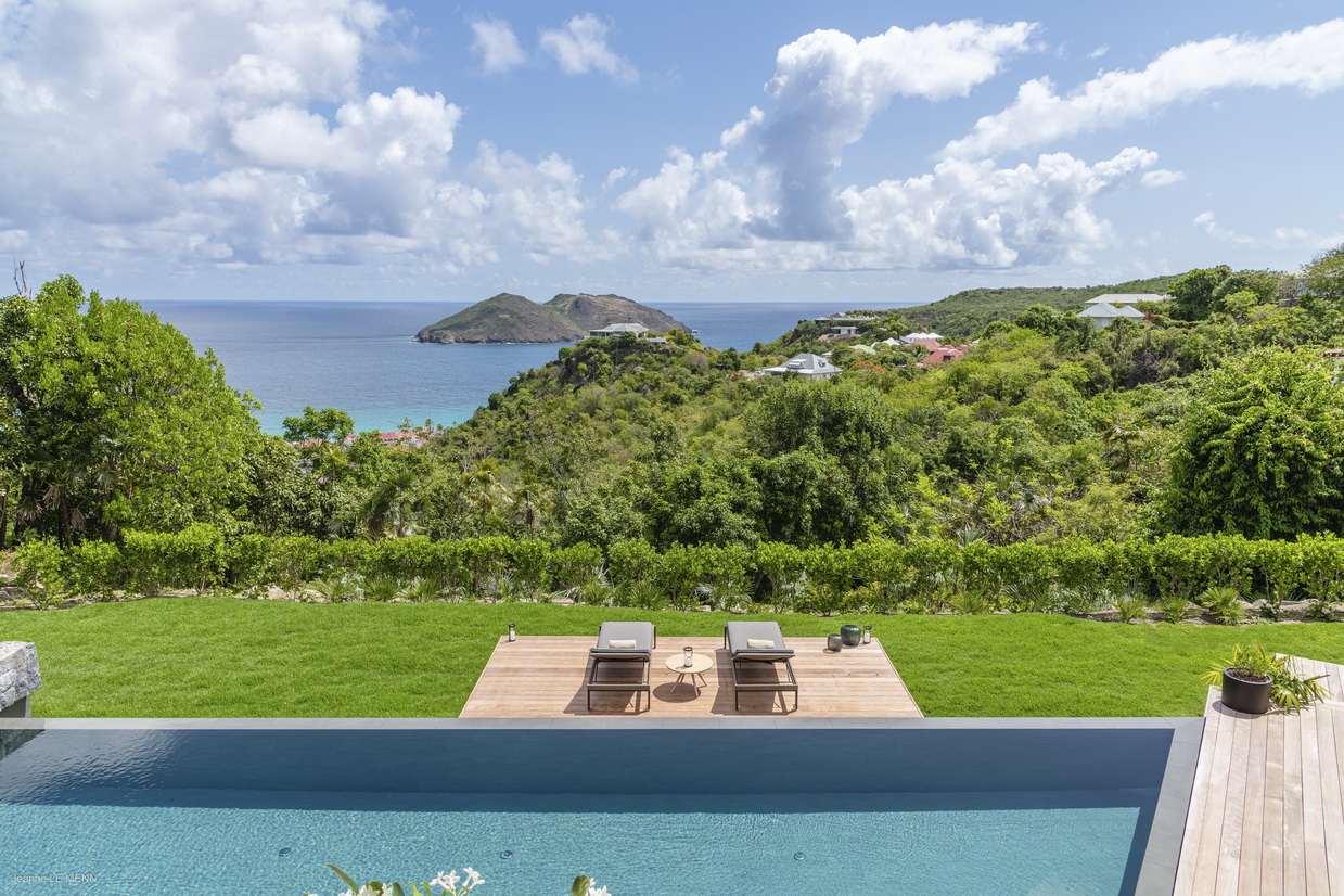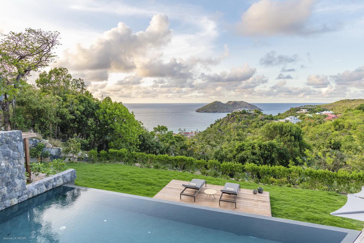 La terrasse est composée d’une piscine chauffée à débordement, d’un salon et d’une salle à manger extérieure pouvant accueillir jusqu’à 10 convives.