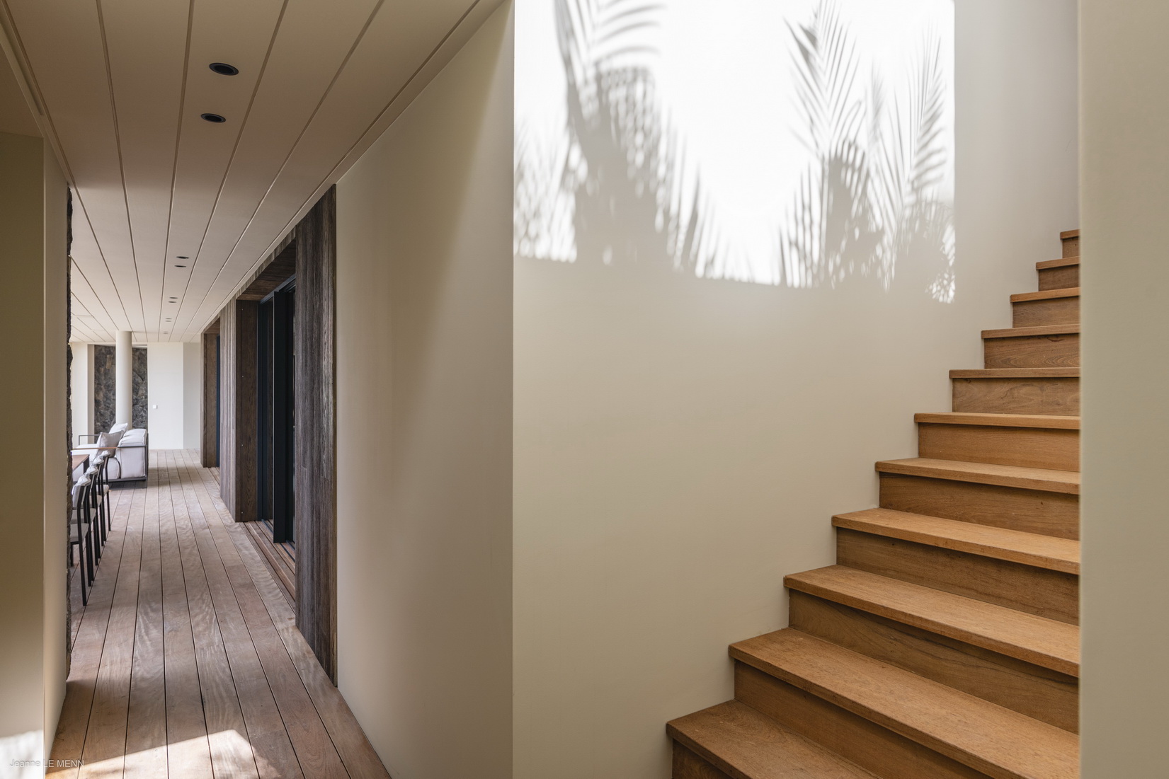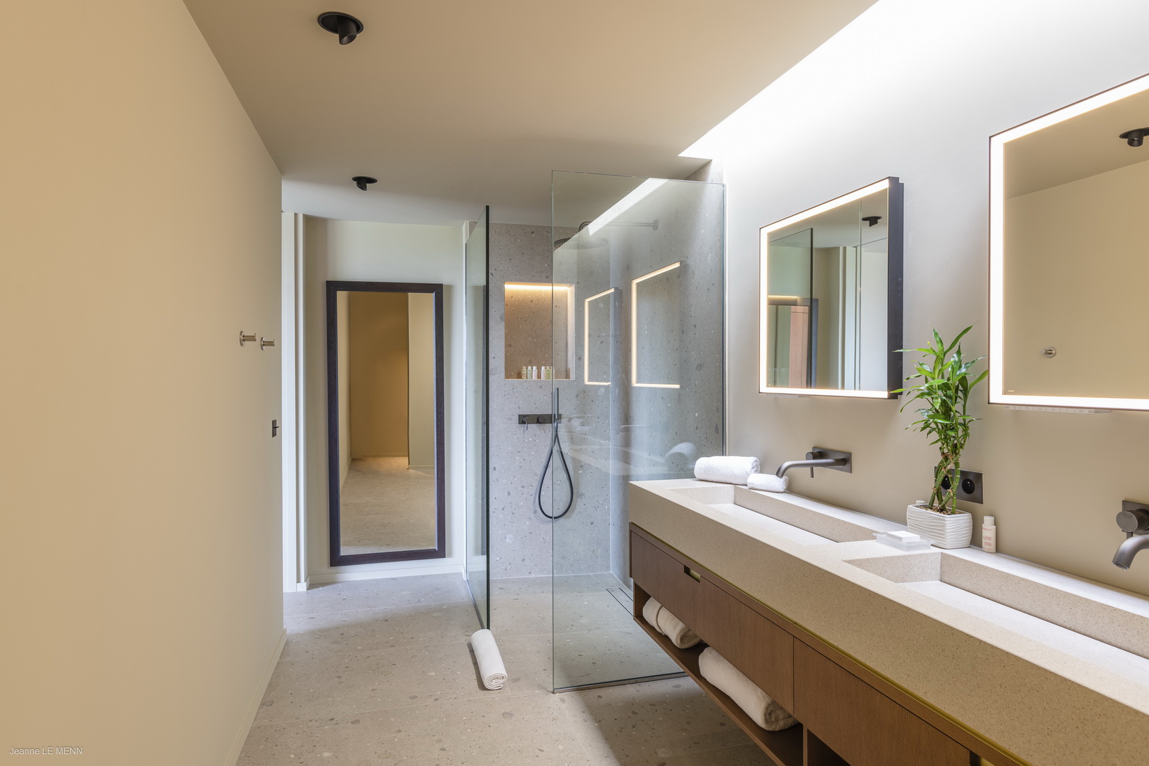 Agencée sur deux niveaux, vous trouverez au rez-de-chaussée un large salon et une cuisine équipée avec une décoration élégante et épurée.