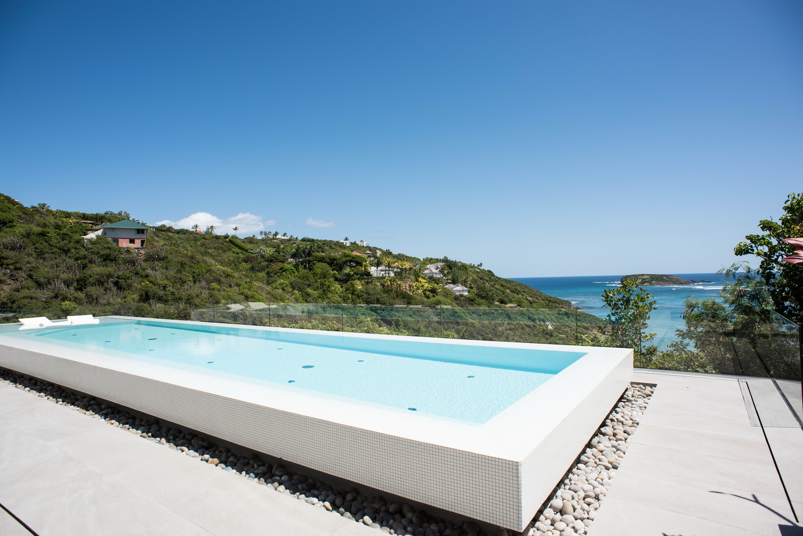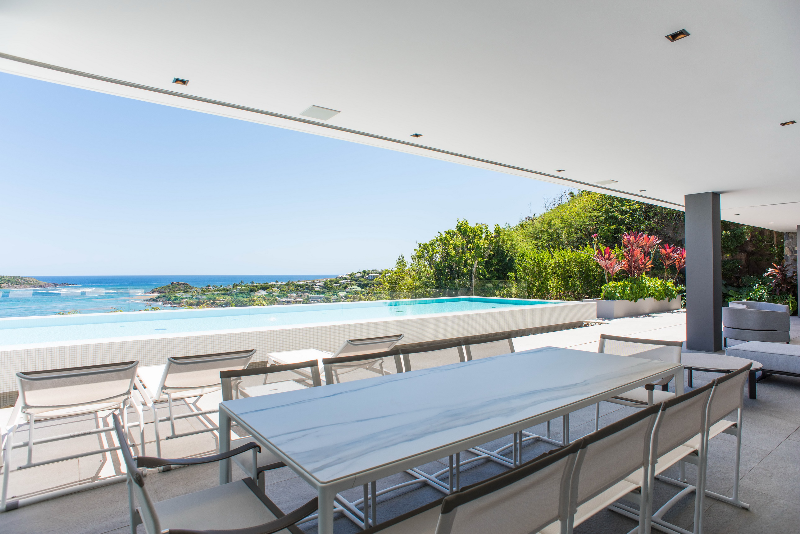 La très grande piscine de 16 mètres de long est un véritable joyau de la propriété, offrant une vue panoramique sur la baie de Marigot.